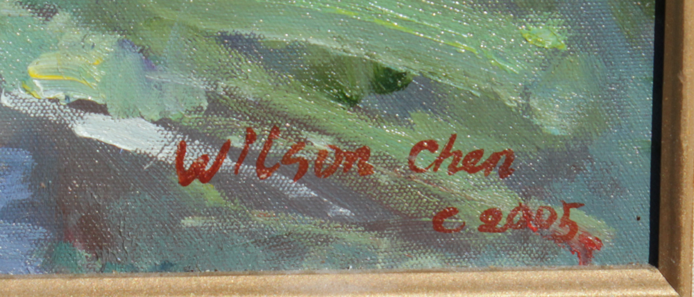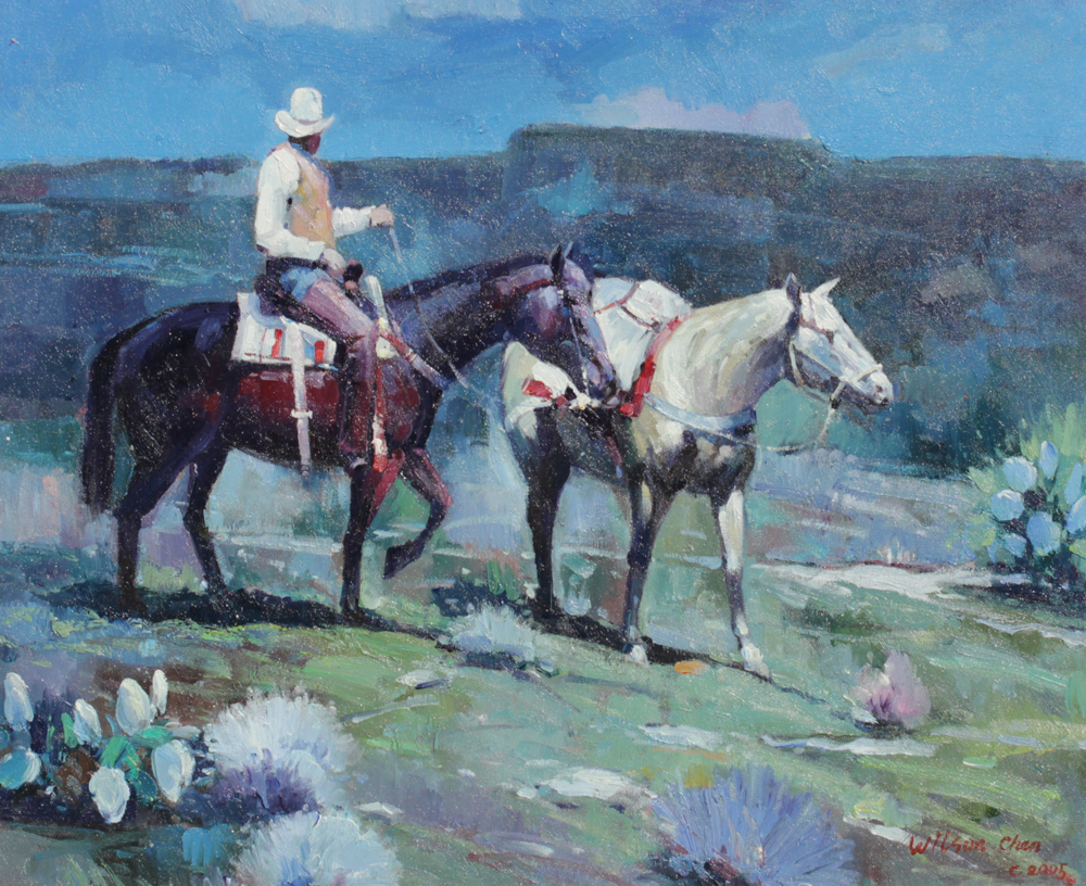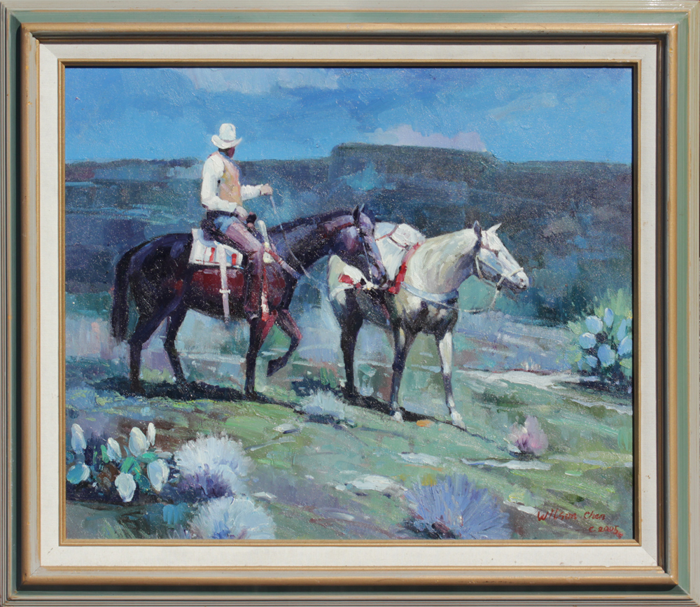 WESTERN COWBOY PAINTING SIGNED WILSON CHEN: Scene Depicts a Cowboy on Horseback with Pack Horse and Prairie Landscape, Oil/Canvas, 20'' x 24'', signed lower right, dated 2005, framed 25'' x 29''.
