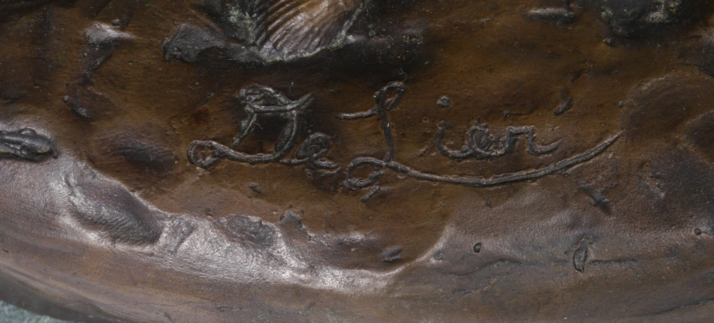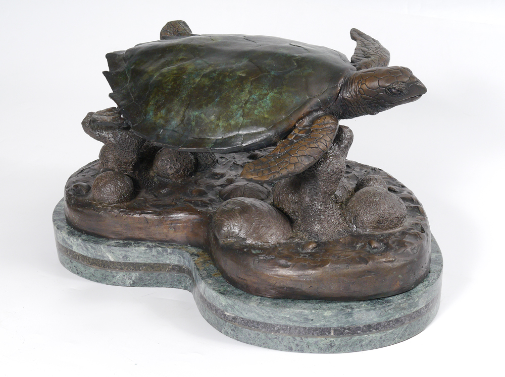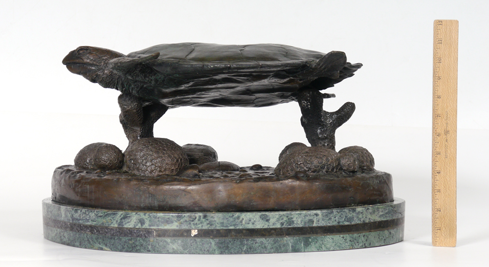 LARGE BRONZE UNDERSEA TURTLE SCULPTURE SIGNED DE LIEN?: 8 1/2'' h. x 22'' w. x 13'' d., incised signature, affixed to a custom marble plinth, overall measurements 11 1/2'' h.