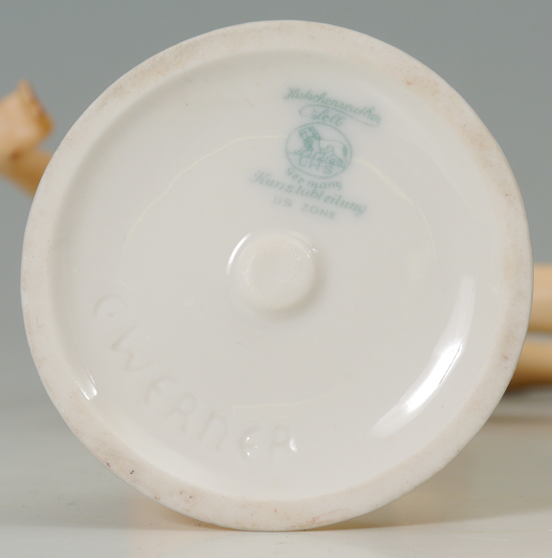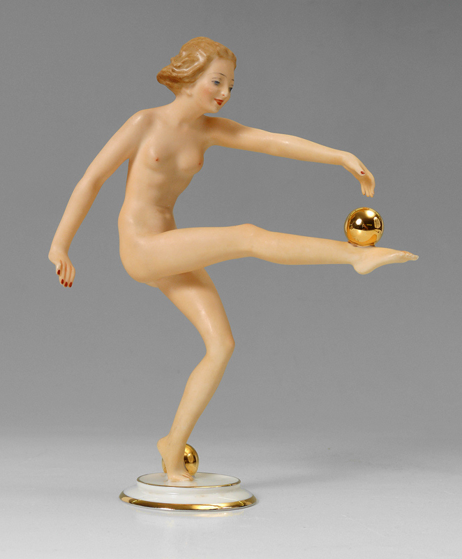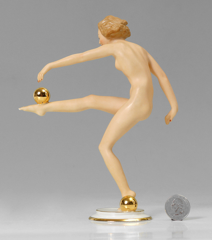 HUTSCHENREUTHER ART DECO NUDE FIGURE: Designed by C. Werner, nude dancer with golden ball at base and on outstretched foot. Marked on base, 8'' h. x 6 3/8'' x 3''.