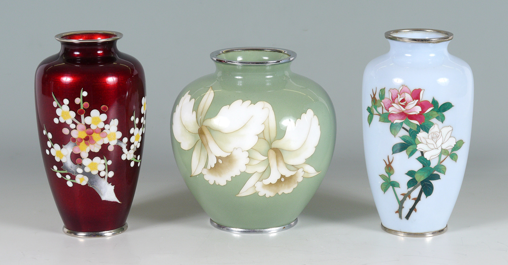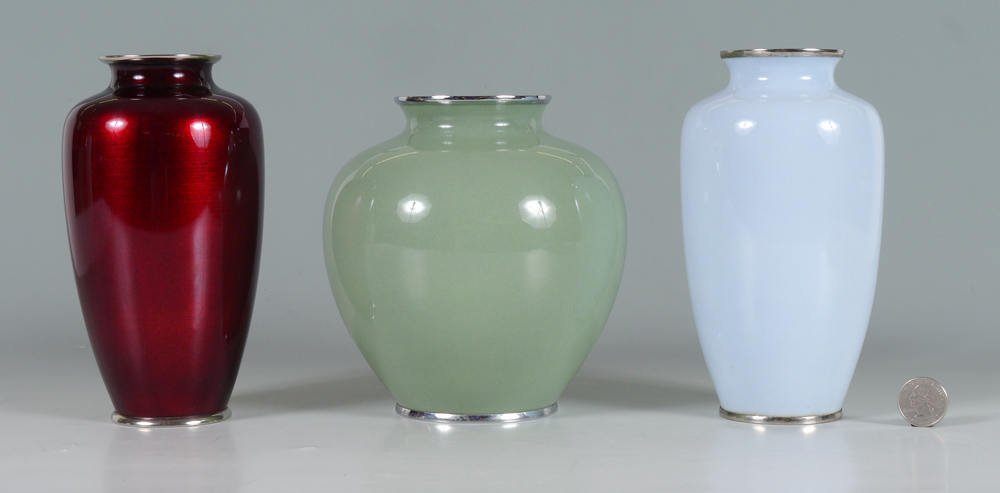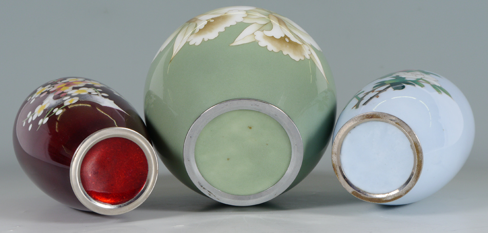 3 CLOISONNE VASES: 3 pieces total to include 1) Squat vase, green ground, floral decoration, 6 1/4'' h. x 6 1/4''. 2) Ox blood ground, floral decoration, 7 1/4''. 3) Light blue ground, floral decoration 7 1/4''.