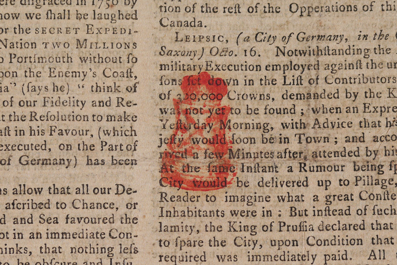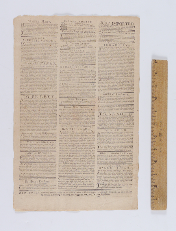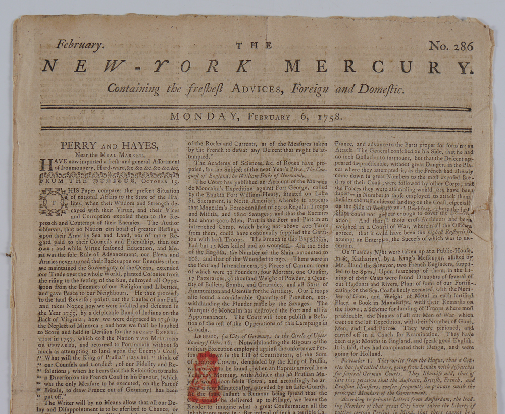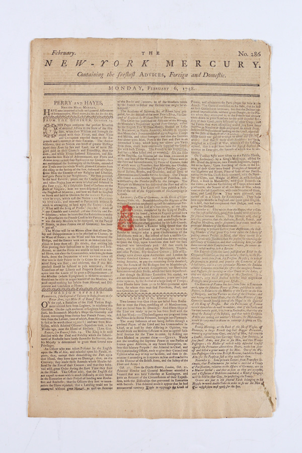 1758 NEW YORK MERCURY FRONT PAGE RM-9 TAX STAMP: February 6, 1758, front page of newspaper contains a rare stamp red tax 1/2 pence tax stamp, (Scotts Cat. NY EP-9, or RM-9, red).
