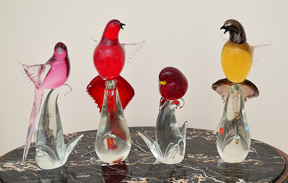 4 FORMIA MURANO ART GLASS BIRD FIGURES: 4 assorted bird figures, all on clear glass bases, Formia Vetri Di Murano clear stickers with assorted other stickers. Provanance from the consignor: From the prior collection of Sorrell Booke who portrayed ''Boss Hogg'' on ''The Dukes of Hazzard''. Tallest 11 1/2'' x 6 1/2''.