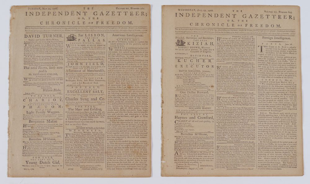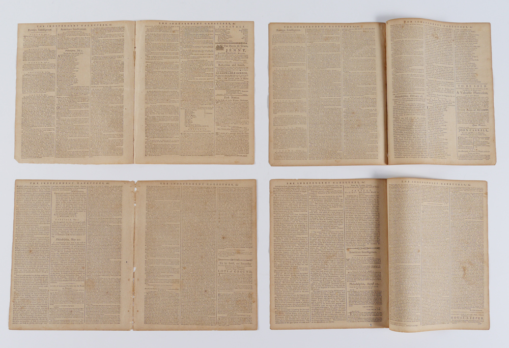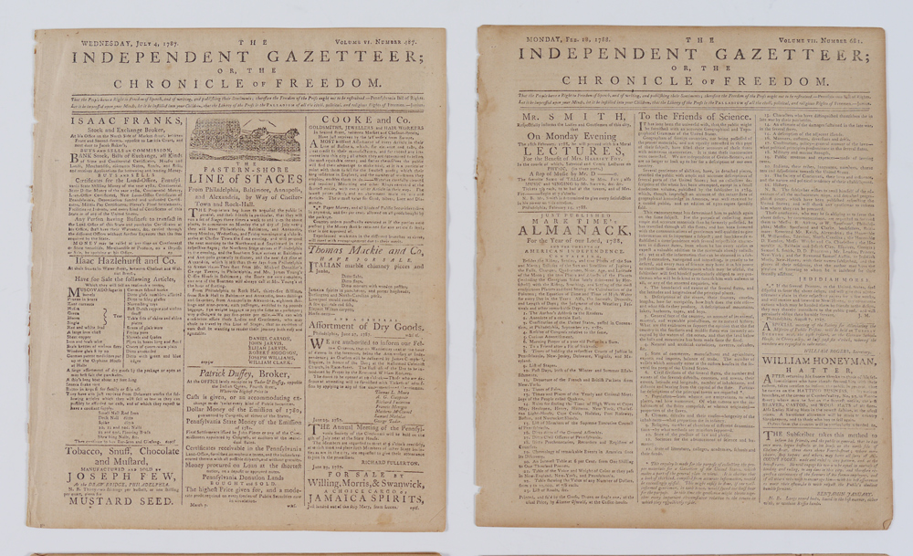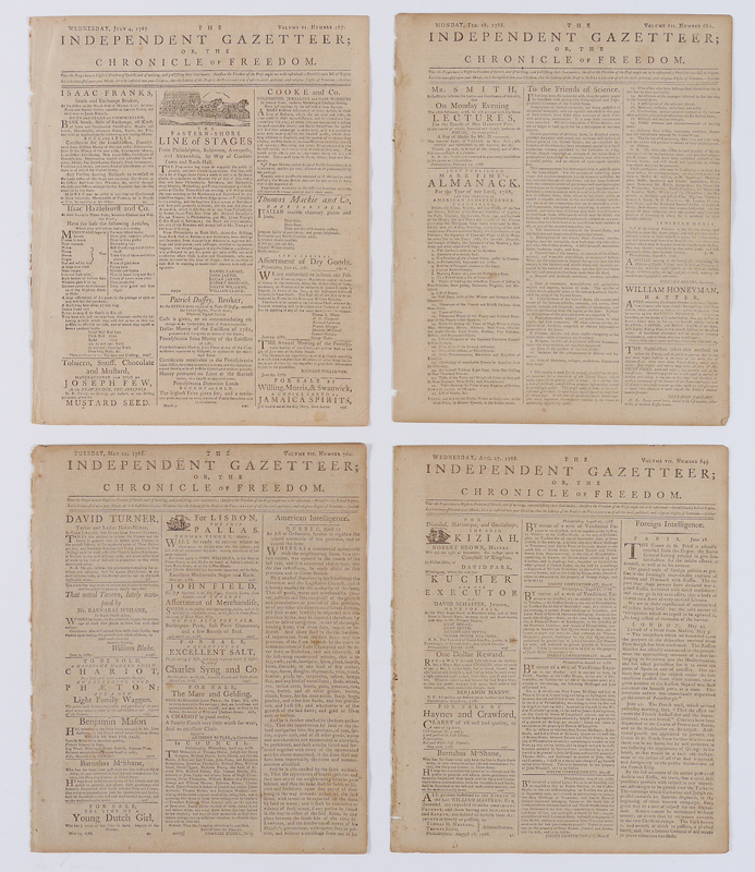 4 PHILADELPHIA INDEPENDENT GAZETTEER NEWSPAPERS: Full title ''The Independent Gazetteer or The Chronicle of Freedom'', 4 pages, on from 1787 the other 3 from 1788, published by E. Oswald. 11 3/8'' x 9 1/4''.