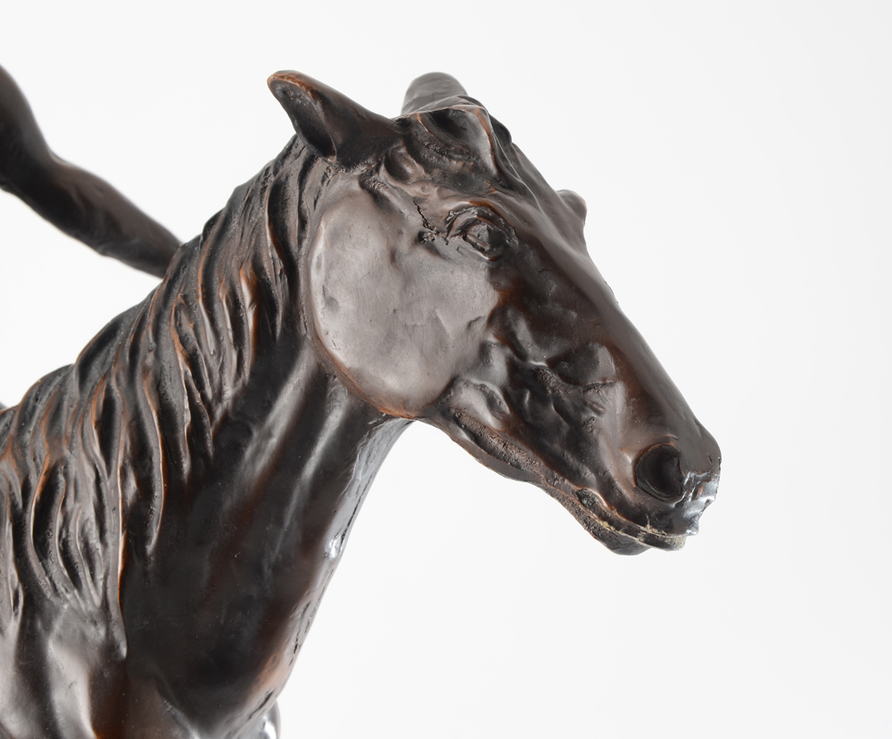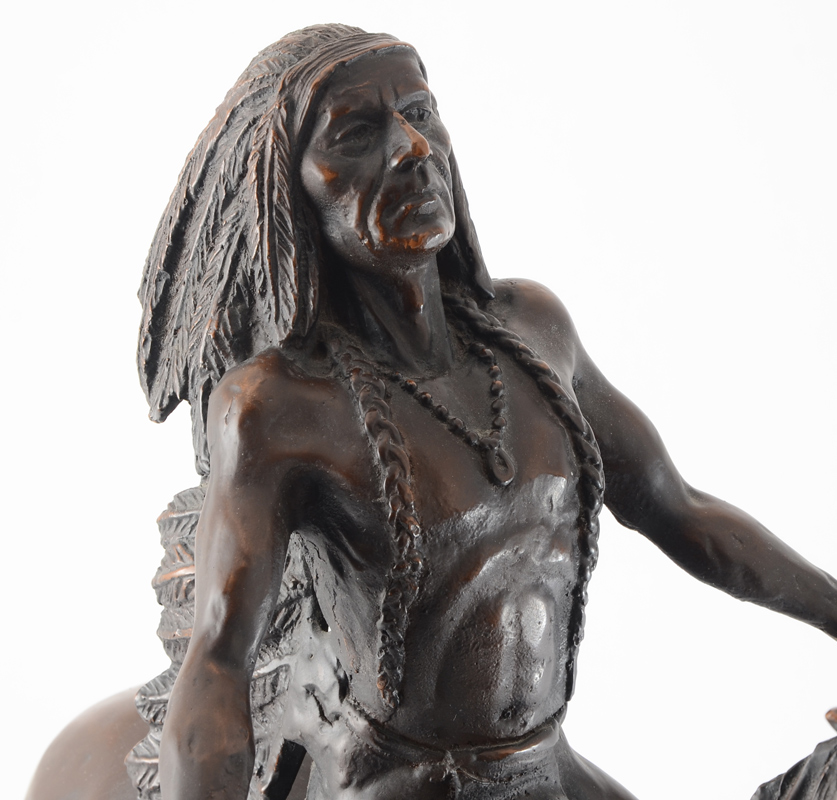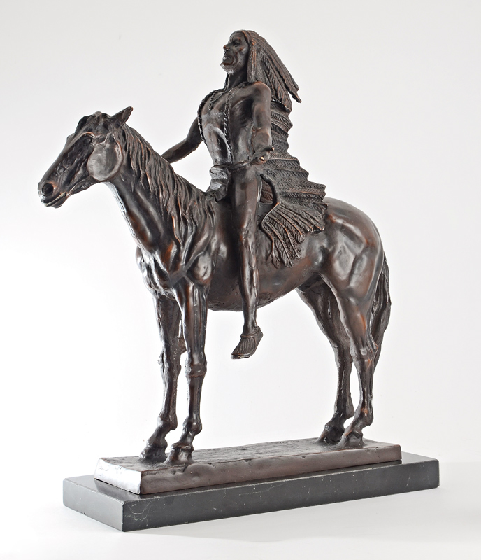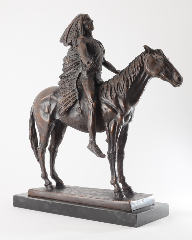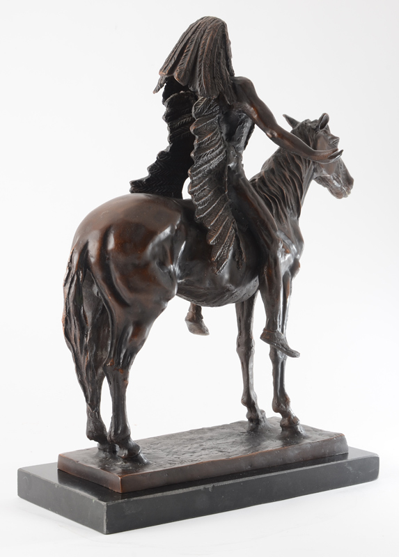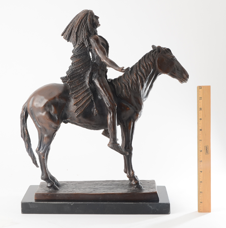 INDIAN BRONZE WARRIOR ON HORSEBACK AFTER DALLIN: 18 1/2'' h. x 16'' w. x 7 1/2'' d.