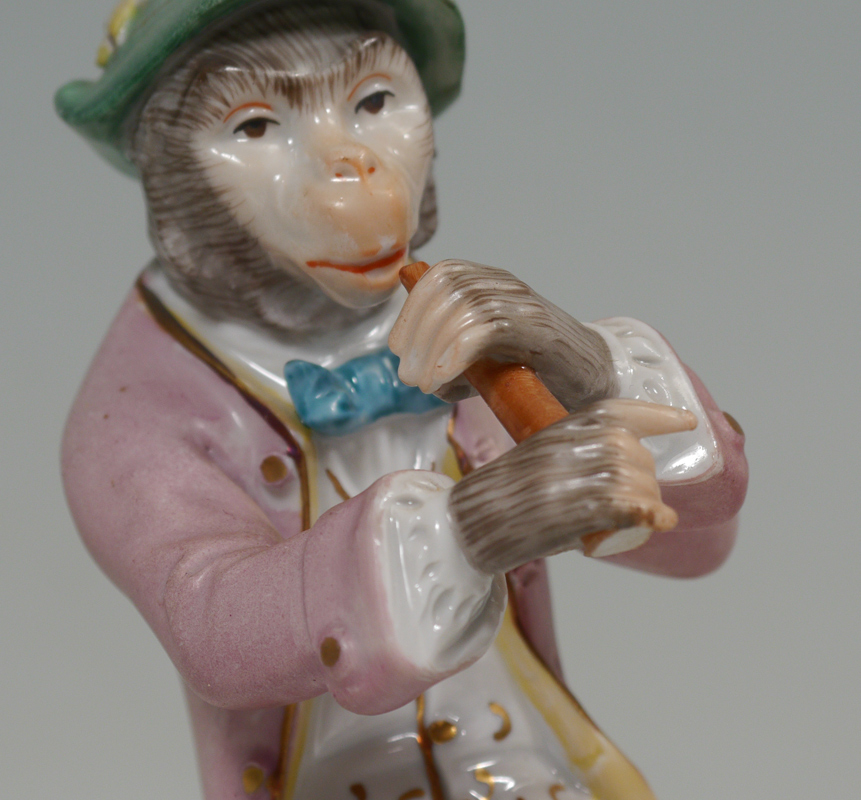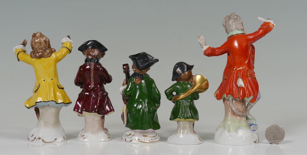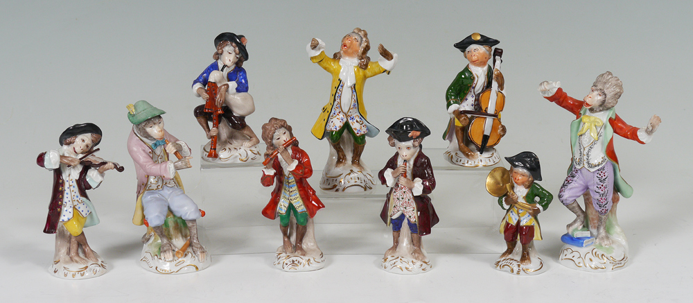 9 PIECE ASSEMBLED PORCELAIN MONKEY BAND: Accumulated collection to include Capo Di Monte, assorted German makers. Tallest measures 6 1/4''.