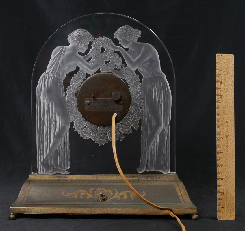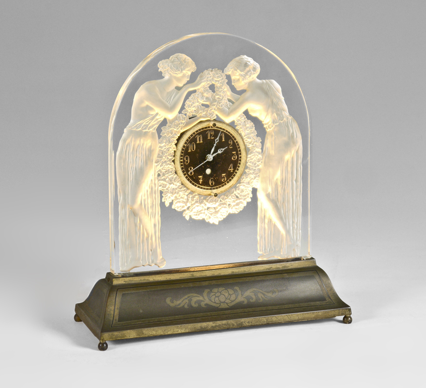 LALIQUE DEUX FIGURINES ETCHED CRYSTAL CLOCK: Clear and frosted with figures of 2 maidens and garland wreath. No visible markings. Electric movement, dial with etched glass Arabic numerals. Illuminated metal base with floral decoration, 4 ball feet. Overall measures 15 1/8'' h. x 13 5/8'' x 5 1/2''. As seen on page 78 in ''Lalique Glass The Complete Illustrated Catalog for 1932''.
