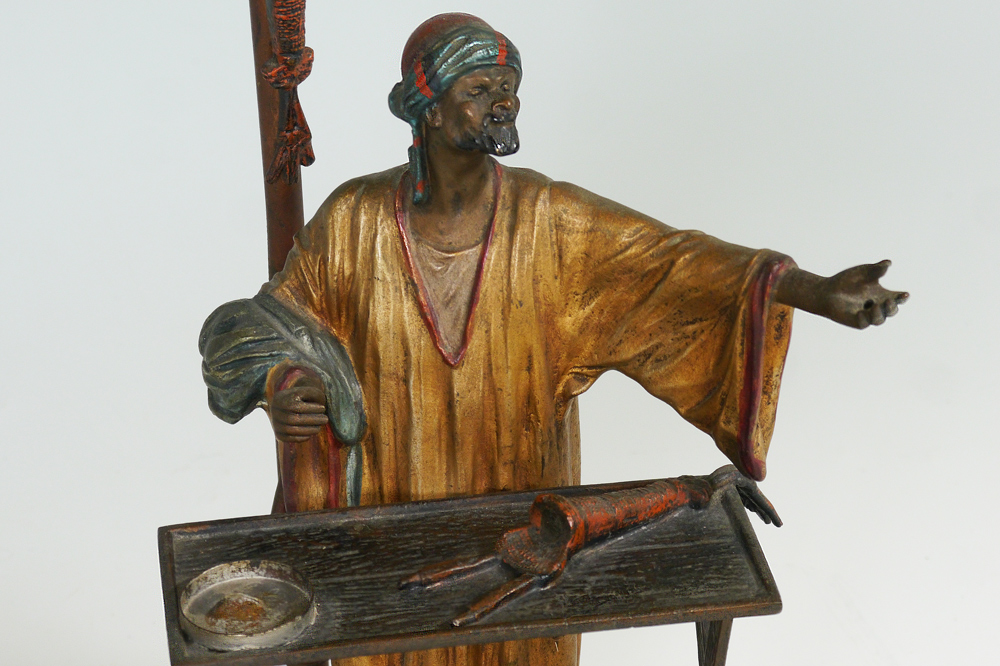 AUSTRIAN ORIENTALIST MERCHANT BRONZE LAMP: Figure of a orientalist merchant selling his wares, standing on cold painted carpet. Marked under carpet ''Austria'', light with multi colored glass shade. Overall measures 17 1/4'' h. x 6 1/2'' x 5''.
