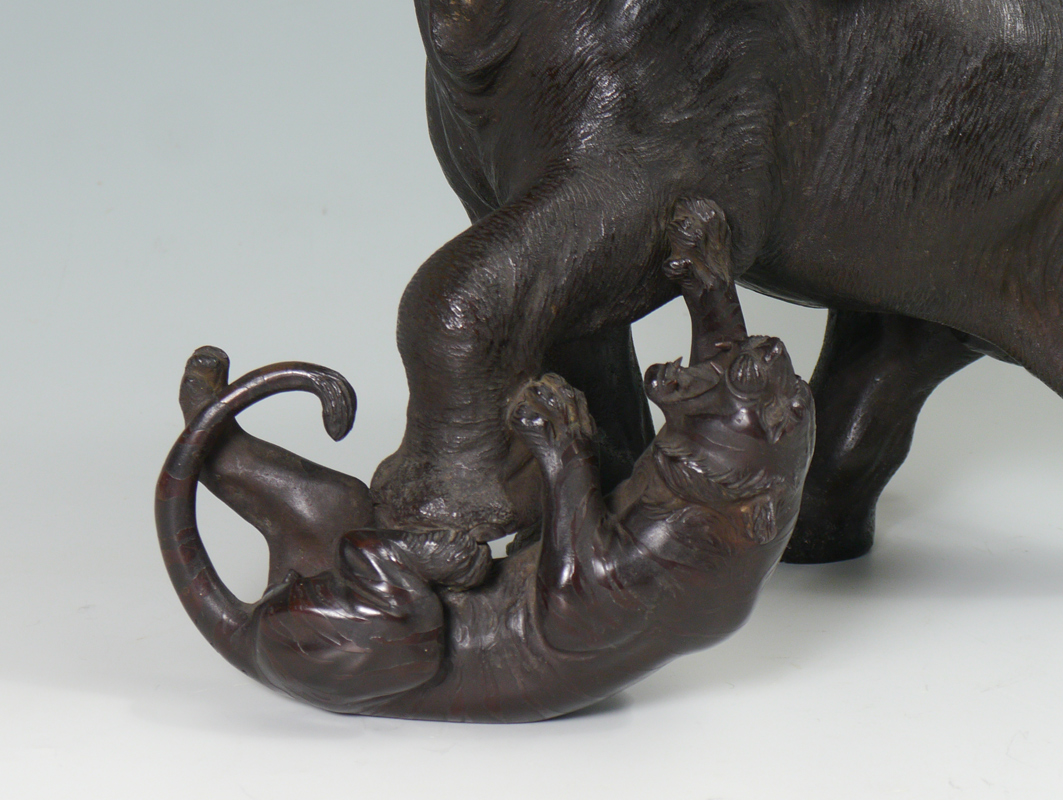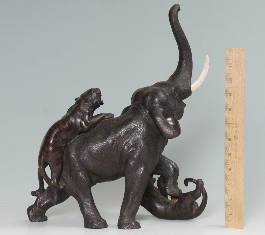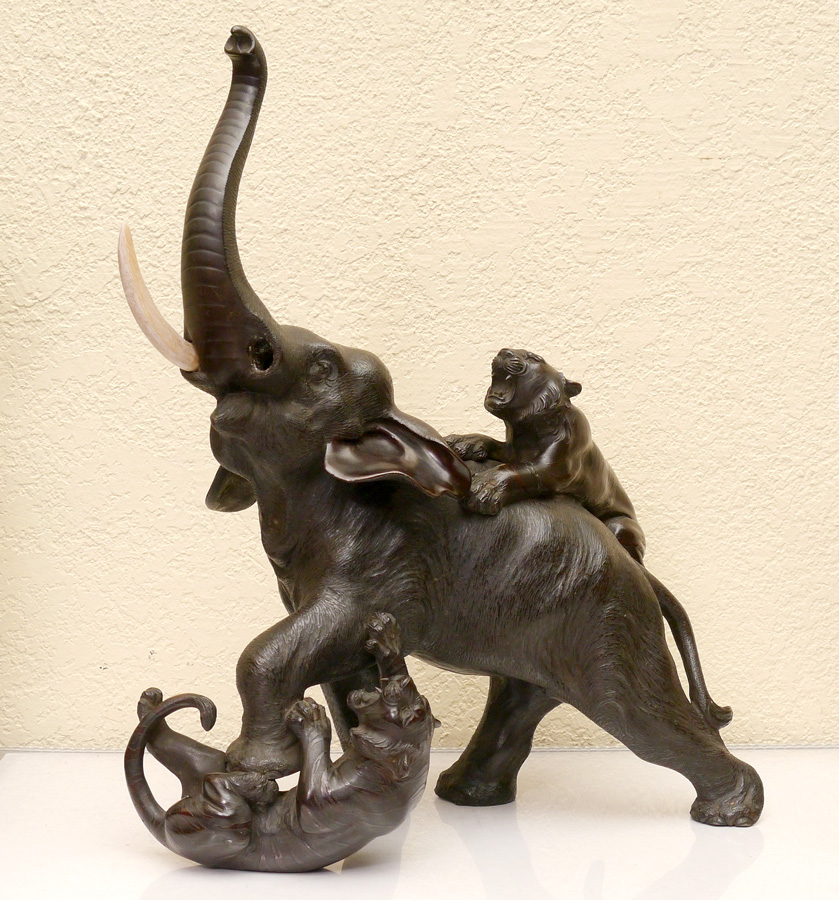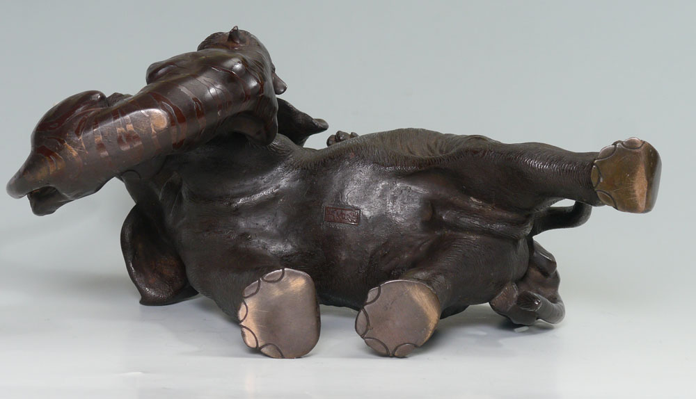 JAPANESE BRONZE ELEPHANT UNDER ATTACK BY TIGERS: Signed on base. Approx. 15.5''h. x 12'' x 8''