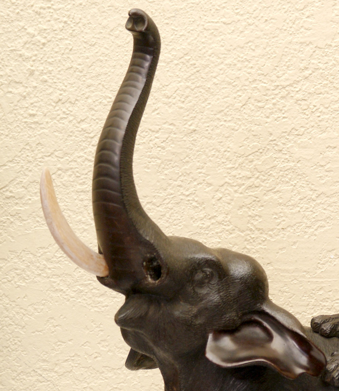 CONDITION: One tusk is ivory, one is not. The elephant sculpture will not be sold with the ivory tusk intact. It will be removed prior to sale.