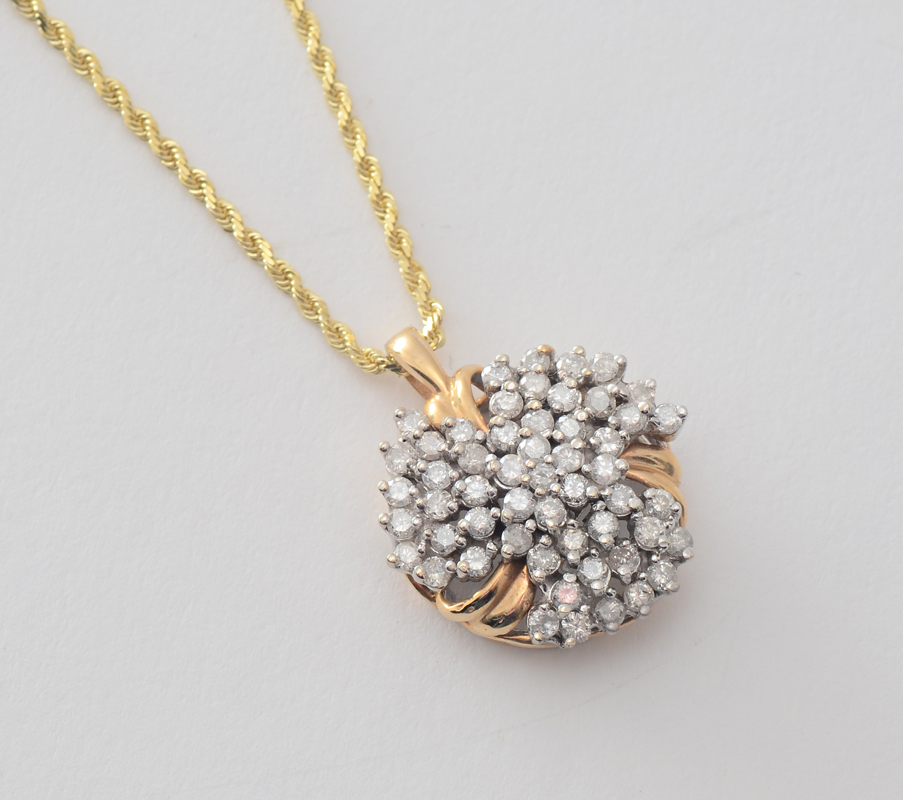 DIAMOND PENDANT NECKLACE: 14K yellow gold pendant of 54 round brilliant diamonds totaling approx. 1.50 Ct., rated SI-I1 in clarity and H-I-J in color. 18K yellow gold 24'' solid rope chain. 14K Weight: 8.3 grams. 18K weight: 8.3 grams