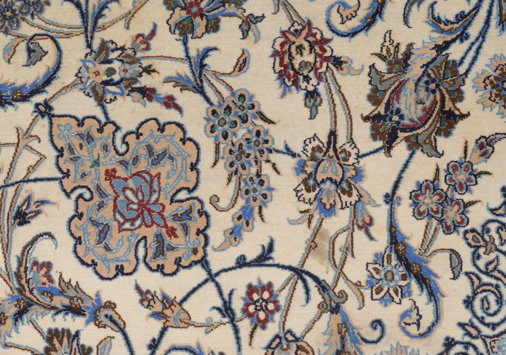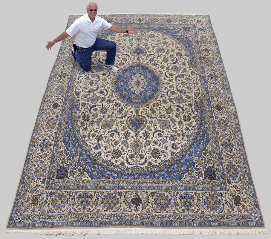 APPROX 20-35 YR OLD PERSIAN NAIN HAND KNOTTED WOOL AND SILK RUG, 10' 6'' X 16' 2 1/2'': This lovely palace sized carpet has a beautifully executed traditional curvilinear design with a small round central medallion in shades of blue resting on a white field that is covered with vines , leaves, and floral motifs. Around the field is a wide band of blue leading into blue grounded corners. The wide white ground of the main border and the small guard borders complete the picture. This rug is very finely knotted and even has silk highlights here and there throughout the rug. This type of rug was highly prized and very expensive in the not too distant past.