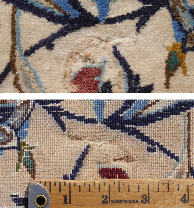 CONDITION: There is some surface soil as well as two small tears, 1/2'' & 1'', in the white main border that are repairable.