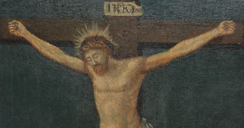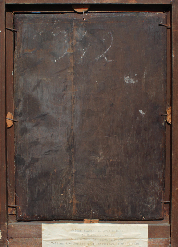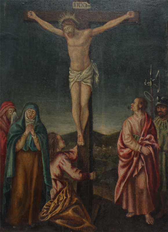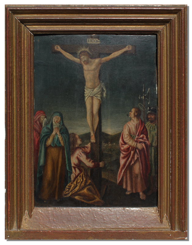 EARLY CHRIST ON THE CROSS PAINTING: Typewritten label verso reads Maitre Flamand du XVI Siecle, Oil/Wood, 1 3/4'' x 8 1/2'', no visible signature, framed, 16'' x 12 1/4''.