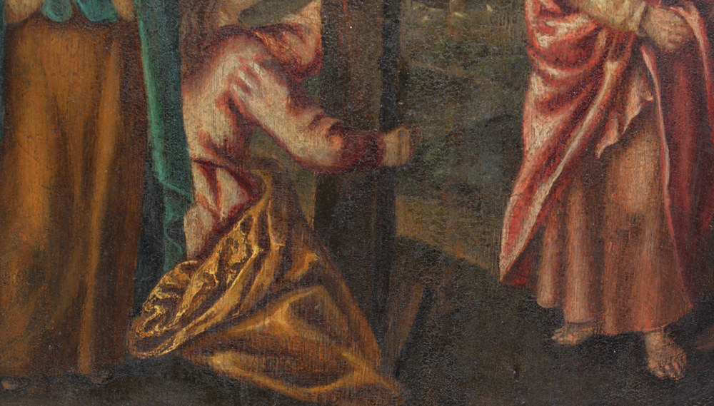 CONDITION: Glued board, vertical crack repaired, needs cleaning, scattered older inpaint, sold as is.