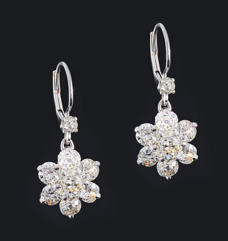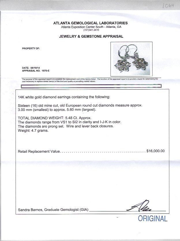 5.48 CT DIAMOND DROP EARRINGS: 14K white gold diamond dangle earrings with 16 Old Mine and Old European cut diamonds, 3.0 mm-5.60 mm, totaling approx. 5.48 Ct., ranging VS1 to SI2 in clarity and I-K color. Wire and lever back closures. Weight 4.7 grams. Sold with current Atlanta Gemological GIA graduate's appraisal for $16,000.