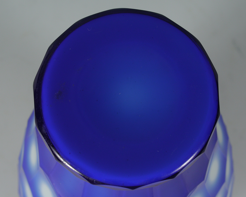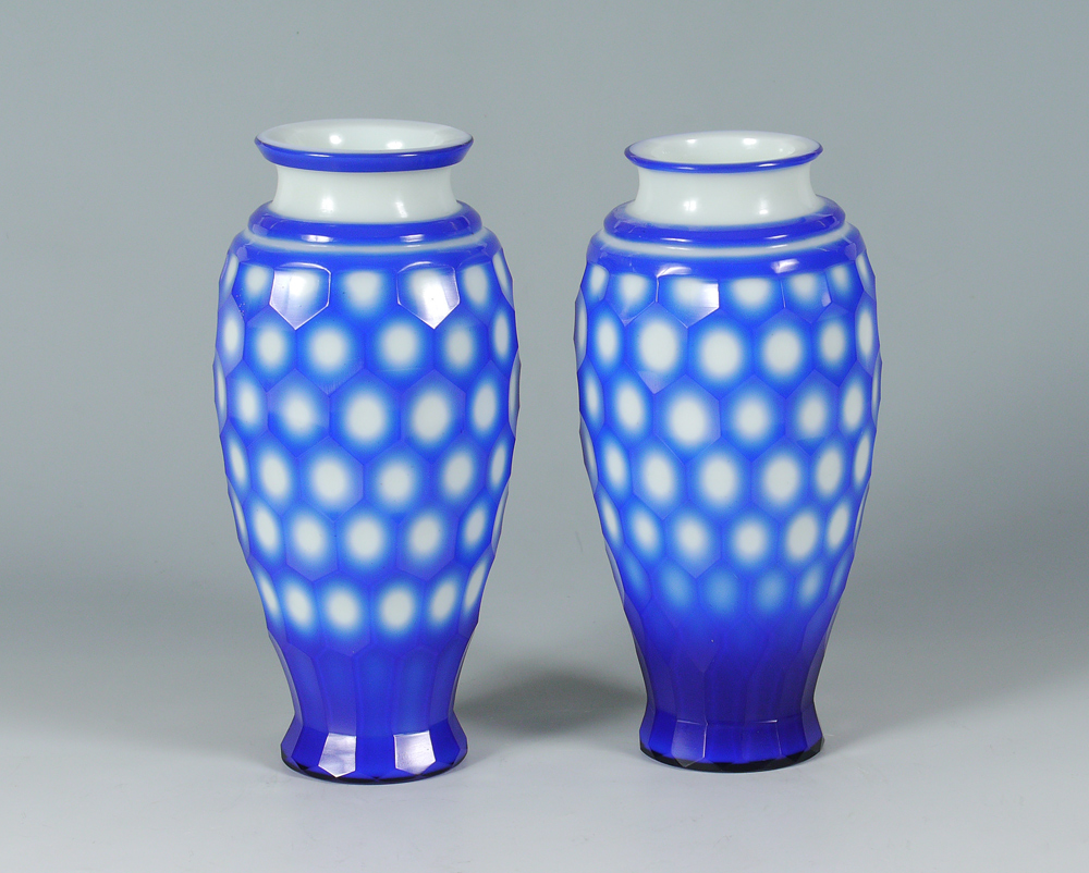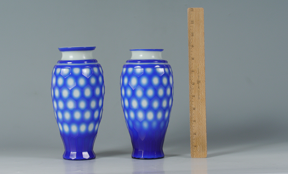 PAIR PEKING GLASS HONEYCOMB VASES: White and blue glass vases with faceted sides in honeycomb pattern. Measures 9'' h. x 4 1/4''.