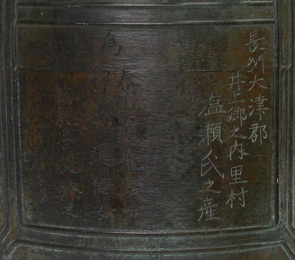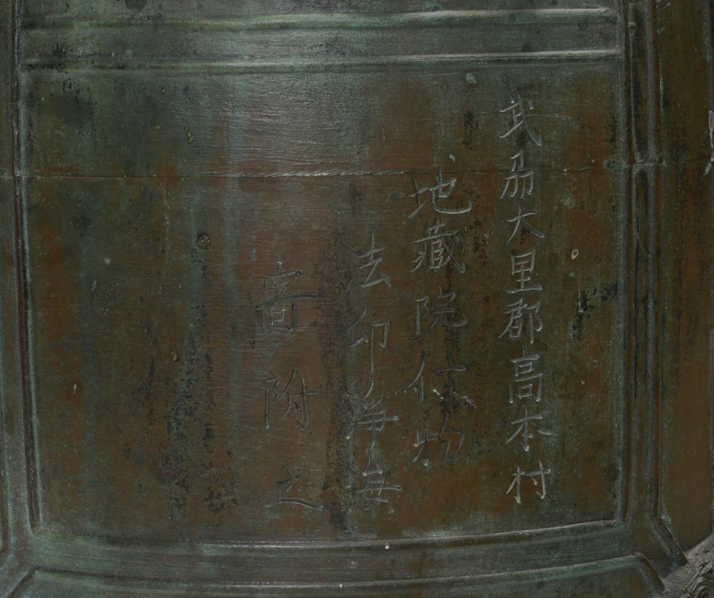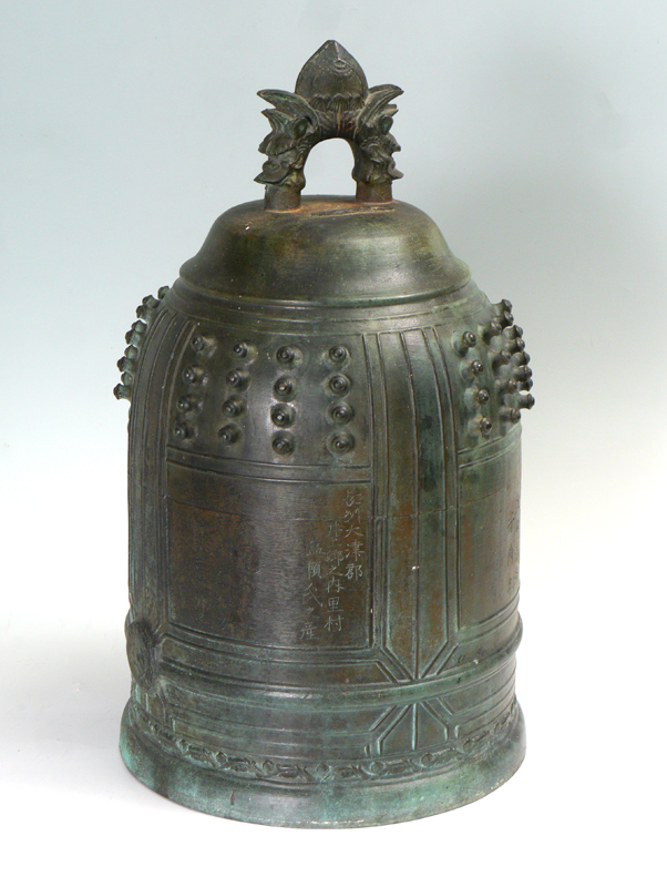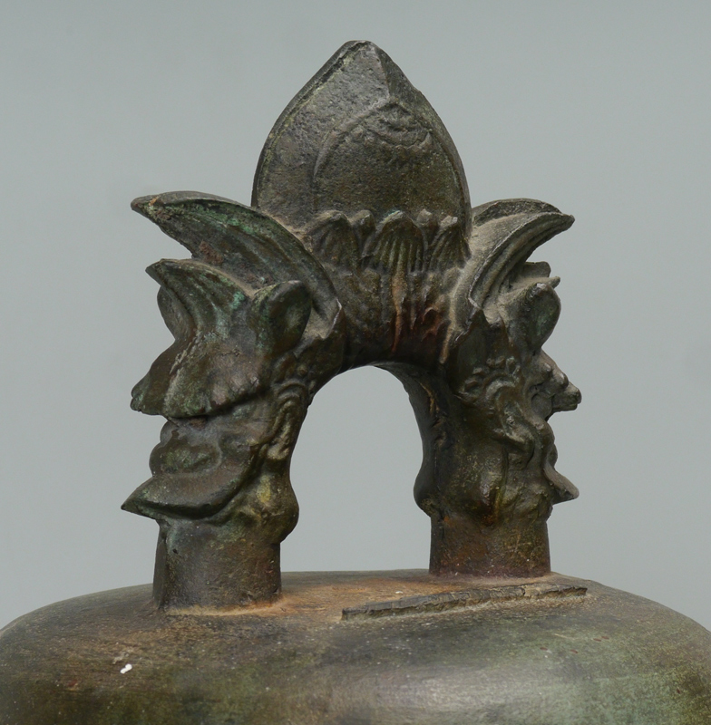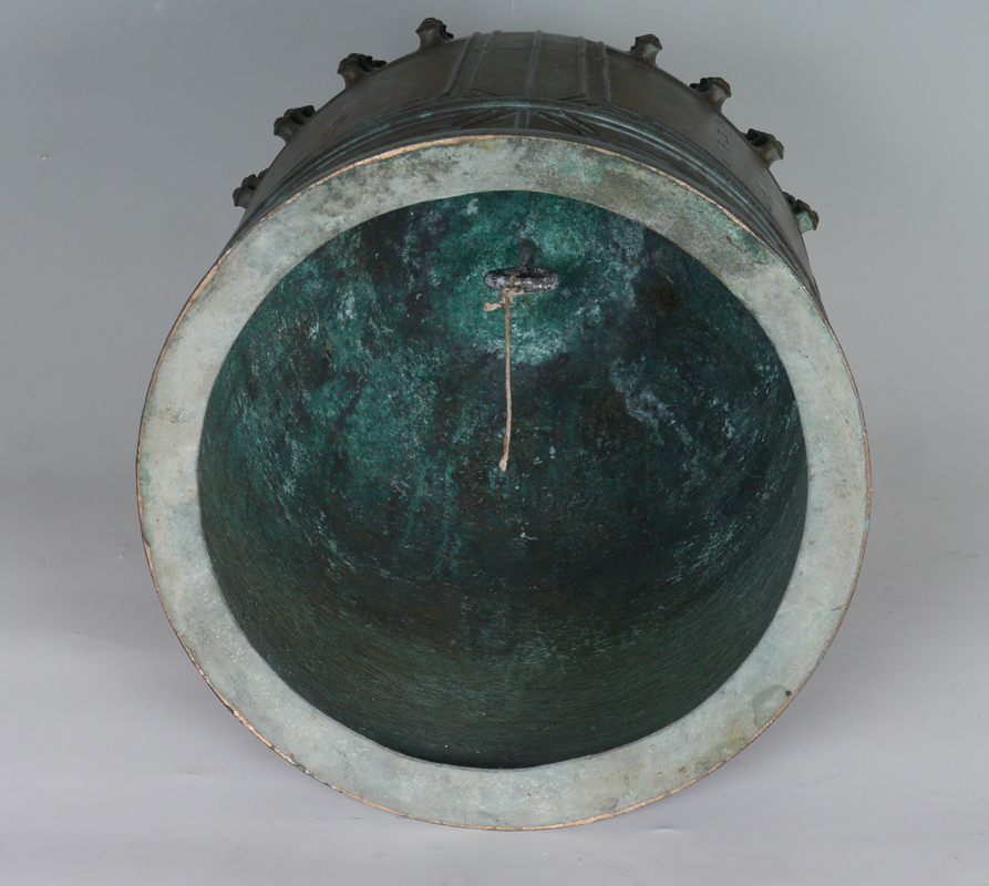 A LARGE BRONZE TEMPLE BELL: Ming Dynasty? with twin dragon head handle, cast in relief with panels of bosses, linear bands and florets, incised with calligraphic panels. 24''h. x 13.5''dia.