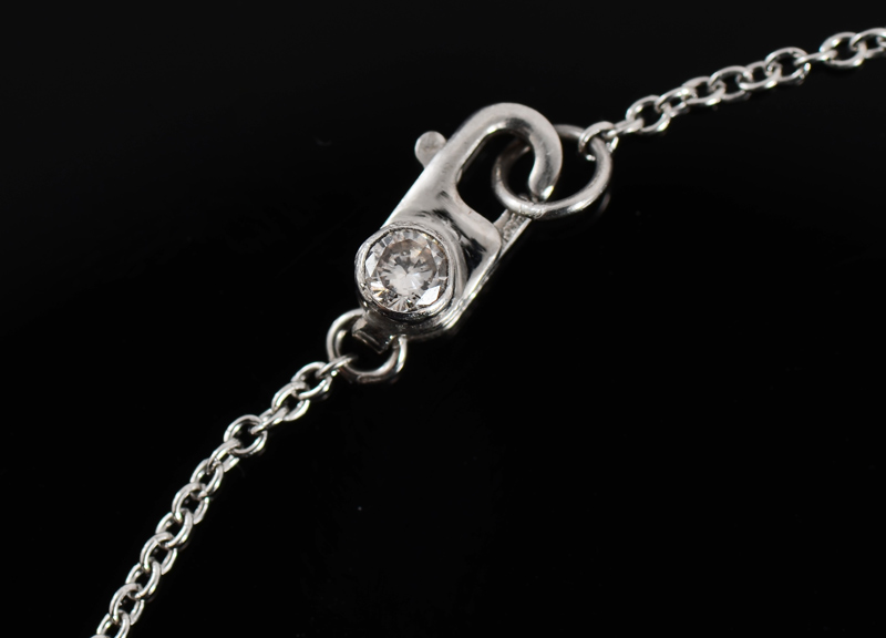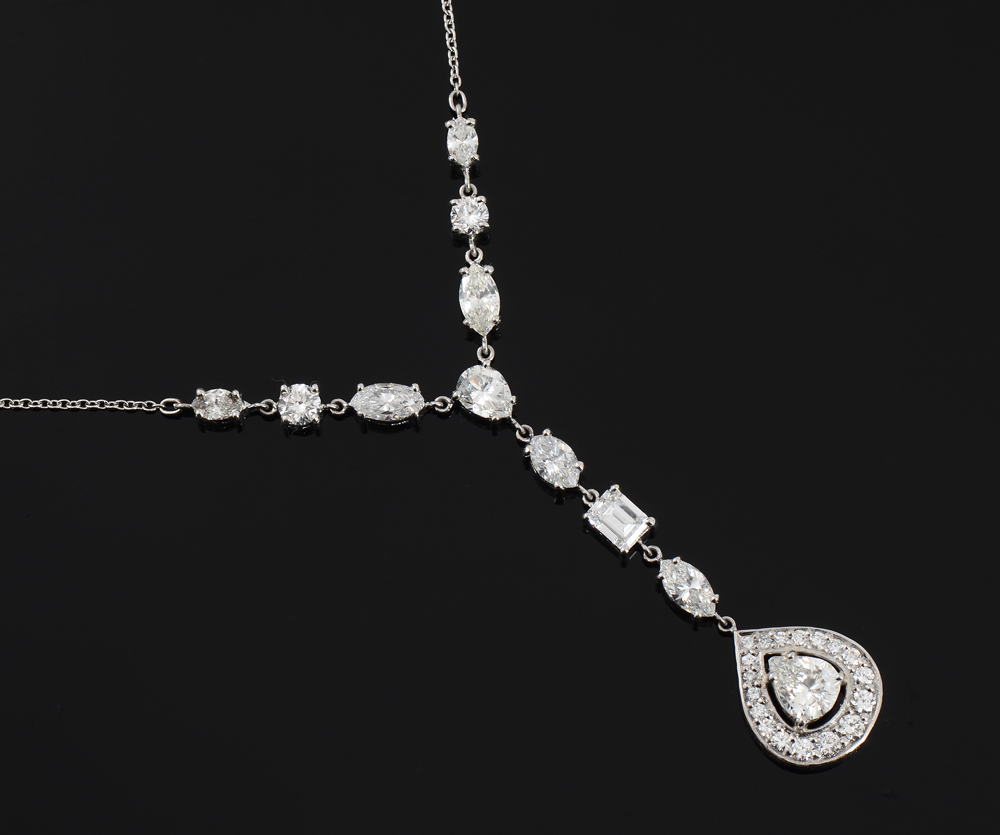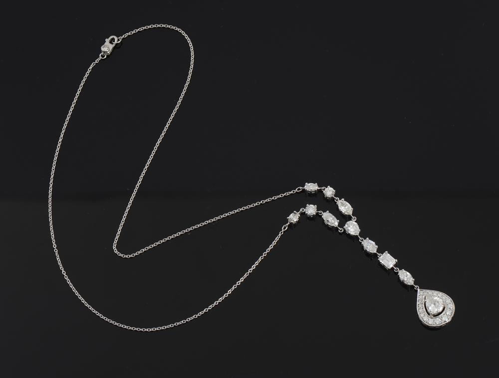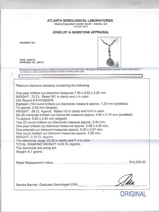 PLATINUM 4.45 CTW FINE FANCY CUT DIAMOND NECKLACE: Hand crafted Y style necklace featuring a GIA certified .72 Ct pear shaped diamond, SI1 clarity and J color. On the chain are 6 marquise cut diamonds, connecting the chain to the large pear are a pear brilliant, emerald cut and round brilliant diamonds totaling approx. 3.15 Ct, VS-SI, F-J color. The diamonds framing the pear total an additional .58 Ct. TOTAL diamond weight: 4.45 Ct. Chain is 16'', drop is 2 1/2''. Weight 6.7 grams. Sold with GIA report for largest diamond and current Atlanta Gemological GIA graduate's appraisal for $15,250.