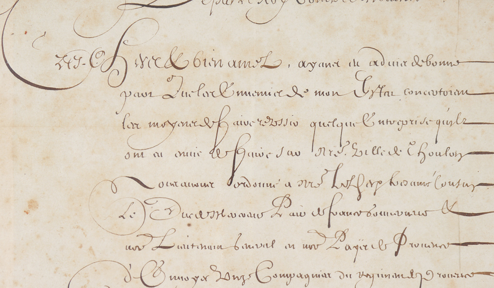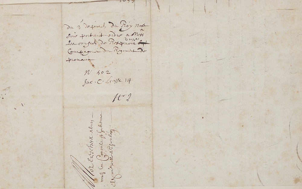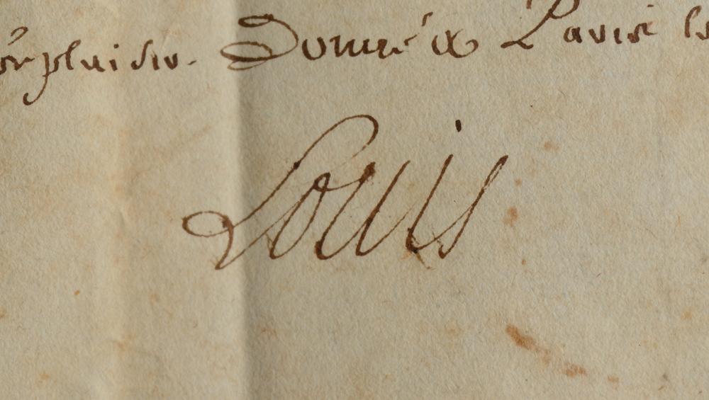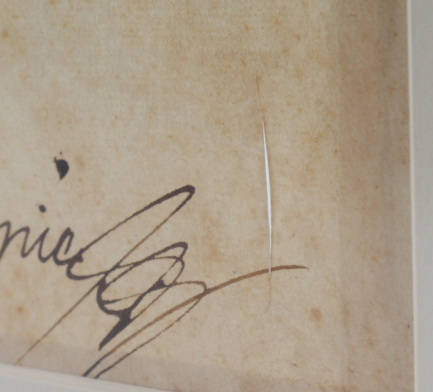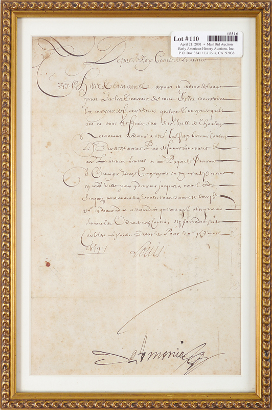 SIGNED FRENCH LOUIS XIV 1659 DOCUMENT: 1659 decree by ''The Sun King'', Louis XIV, not translated, counter signed with illegible signature below. Sight size 12 1/2'' x 8'', framed and matted in double side frame, 15 3/8'' x 10 3/8''.