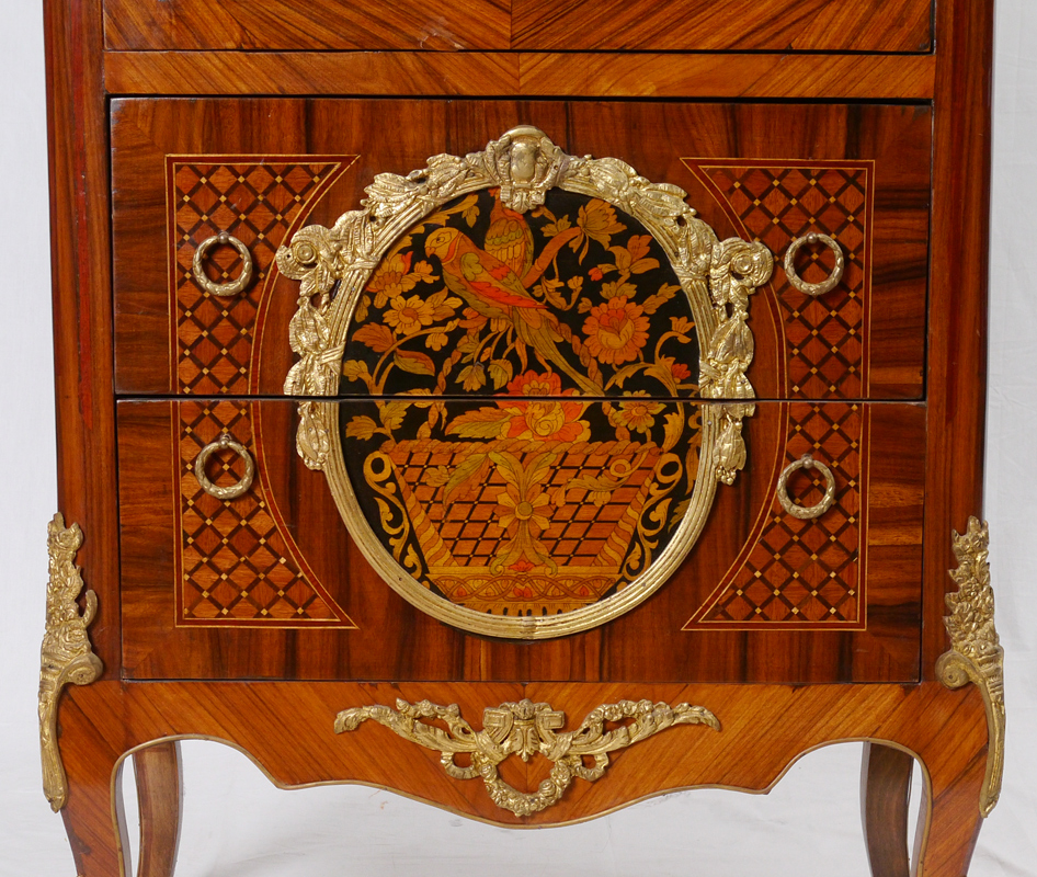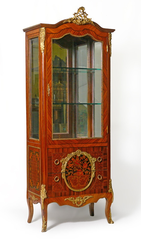 FRENCH VITRINE, MARQUETRY AND PARQUETRY INLAY ORMOLU DECORATED DISPLAY CABINET: Shaped crest with applied ormolu decoration, beveled glass front door and sides, mirrored back interior with 2 glass shelves. 2 drawers with marquetry inlaid medallion featuring birds in basket motif, framed in applied ormolu, shaped skirt. Measures 75 1/2'' h. x 28 3/4'' x 17 3/4''.