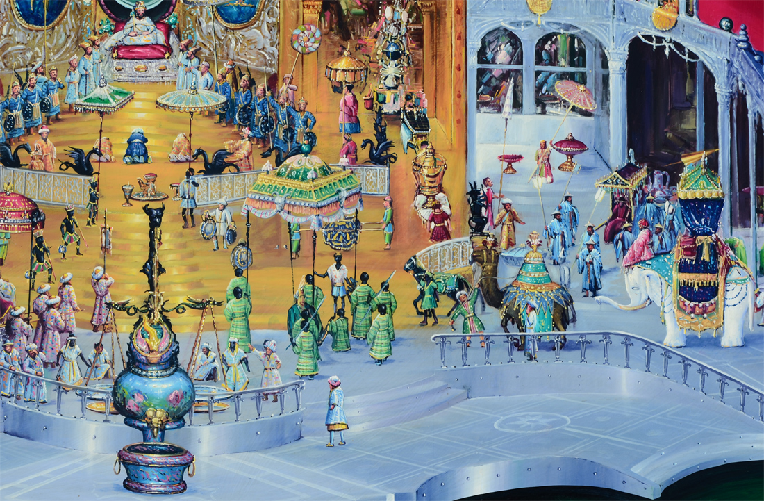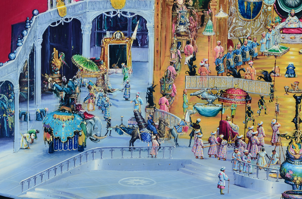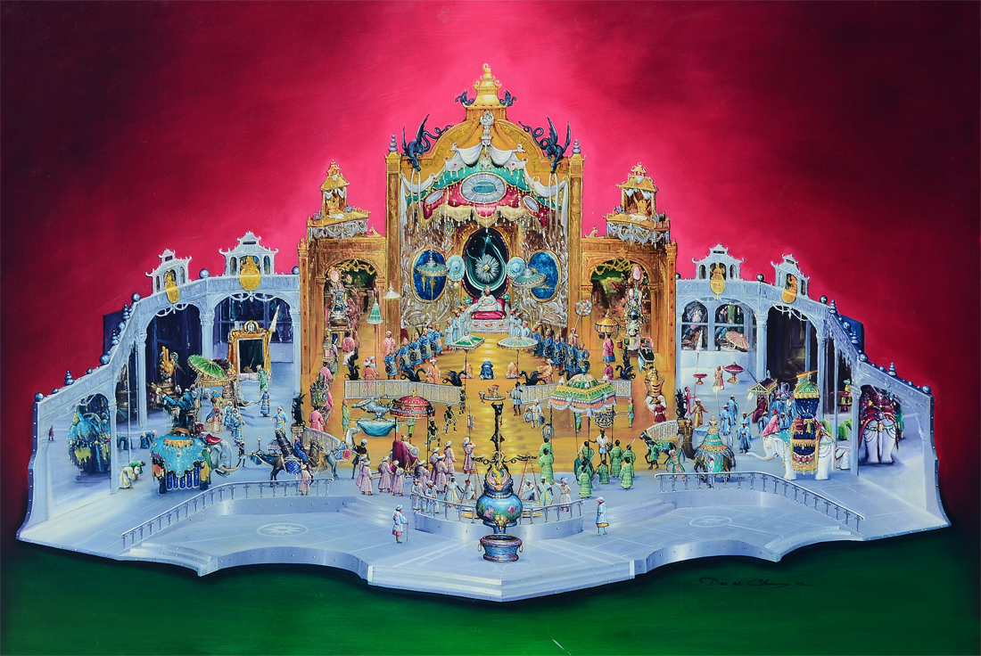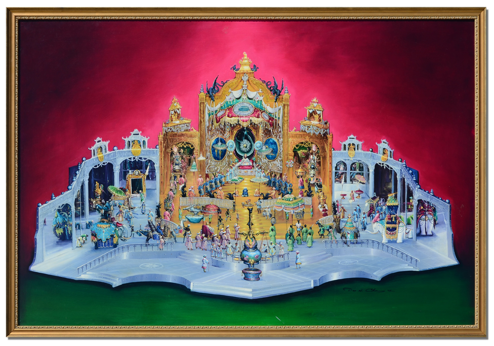 LARGE PALACE FESTIVAL PAINTING SIGNED DAE H. CHO?: Oil/Masonite, 48'' x 72'', signed lower right, dated '97, framed 51 1/4'' x 75 1/2''.