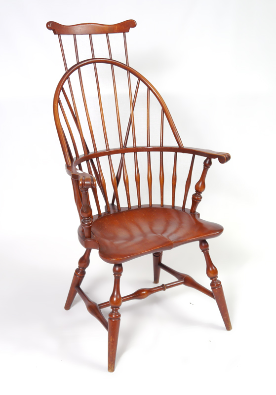 COMB-BACK WINDSOR CHAIR: High back with shaped top rail, curved back with spindle supports, carved hand holds, shaped seat, on 4 turned legs with stretchers. Overall measures 46 1/2'' h. x 25 1/4'' x 24''. CONDITION: Wear consistent with age and use.