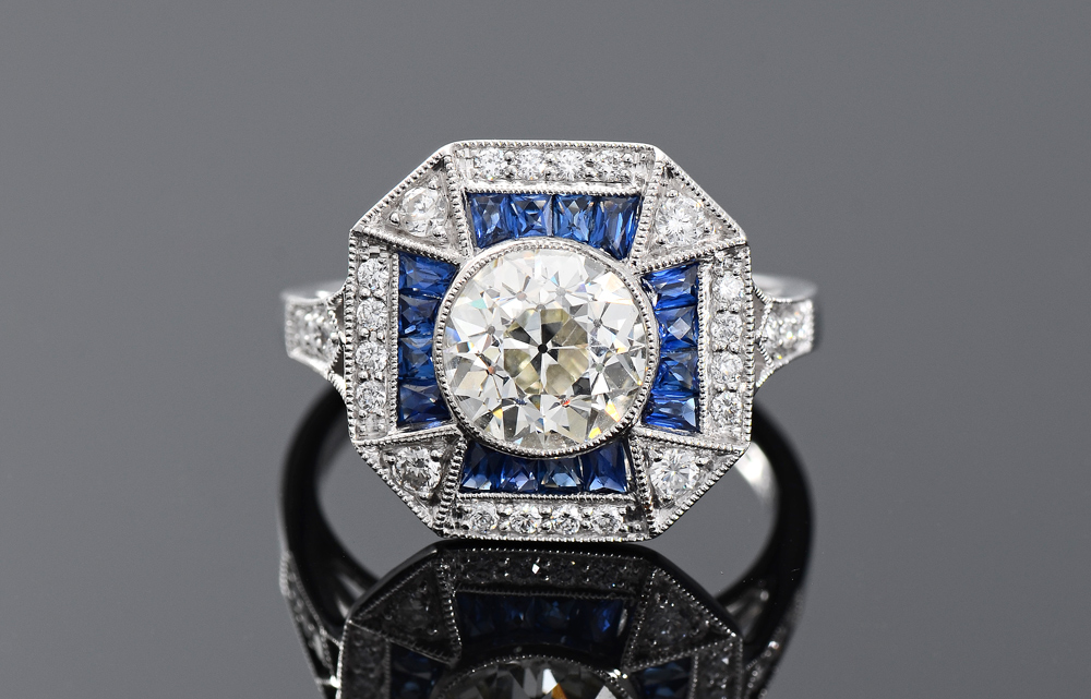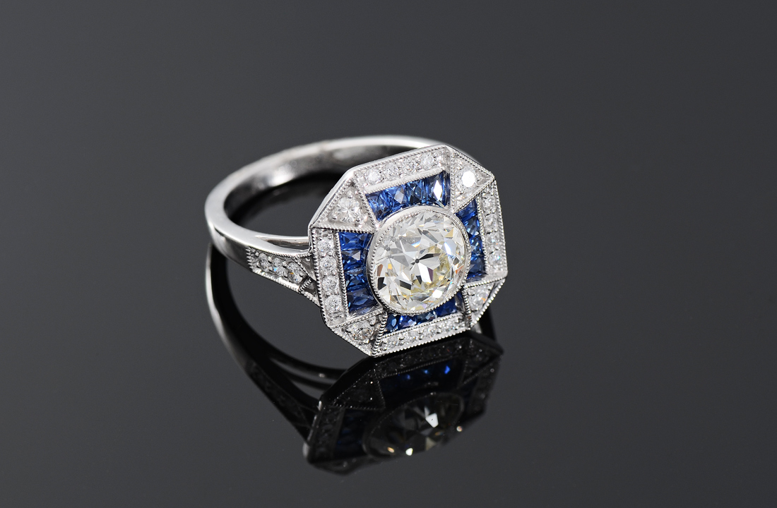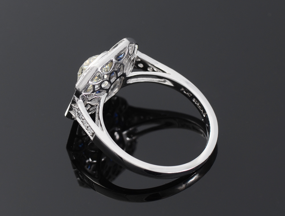 PLATINUM SOPHIA D DIAMOND AND SAPPHIRE RING: Centering a 1.60 Ct Old European cut diamond of VS-1 clarity and K color. Framed by a unique Maltese cross design in natural blue sapphires totaling approx. .58 Ct, and round brilliant diamonds totaling approx. .30 Ct., averaging VS-SI in clarity and G-H color. Size 6. Weight 6 grams. Sold with current Gesner Appraisal Services GIA graduate gemologist appraisal for $18,525.