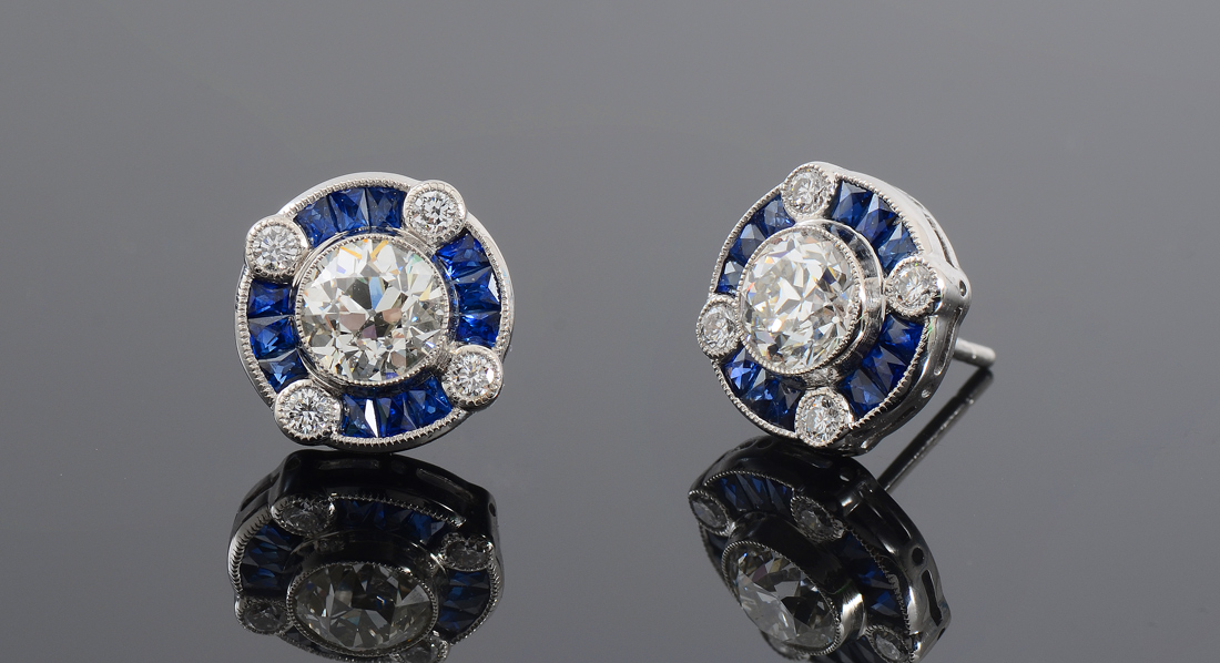 SOPHIA D PLATINUM DIAMOND & SAPPHIRE EARRINGS: Art Deco button style platinum earrings centering a .91 and a .97 Ct round brilliant diamonds, VS1 in clarity and I-J color. 8 round brilliant diamonds total approx. .40 Ct., VS clarity, G-H color. 24 channel set French cut sapphires total 2.25 Ct, VS clarity and 3-4 saturation. TOTAL diamond weight 2.28 Ct. Diameter .5''. Weight 6.7 grams. One of the large diamonds has a GIA certificate. Sold with current Atlanta Gemological GIA graduate's appraisal for $19550.