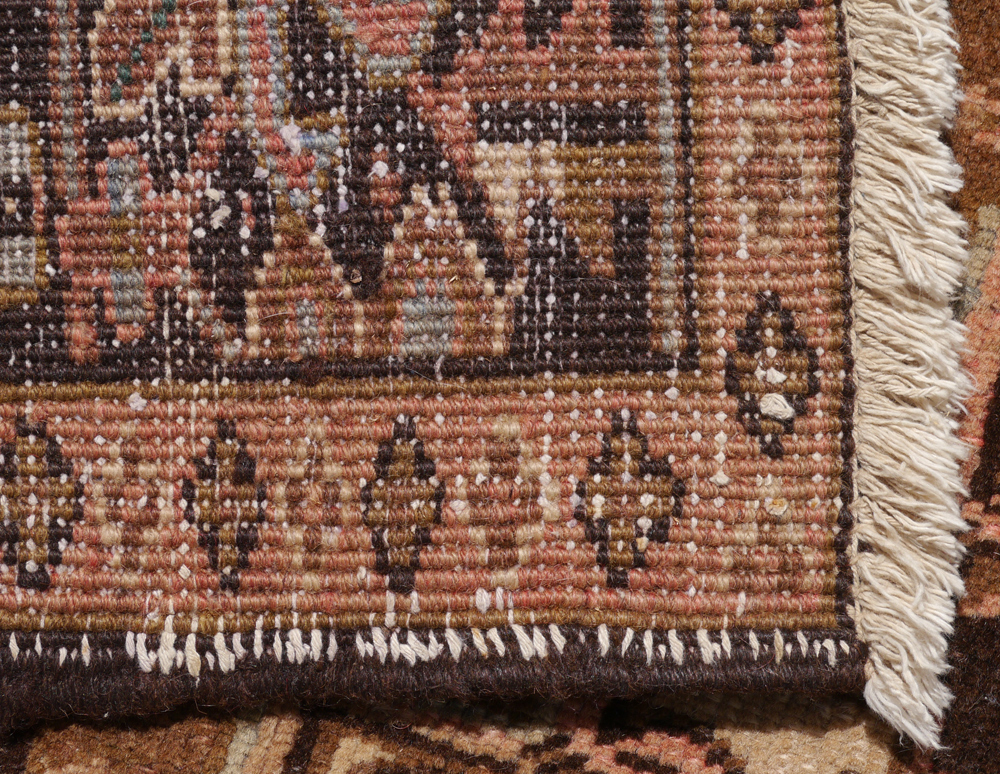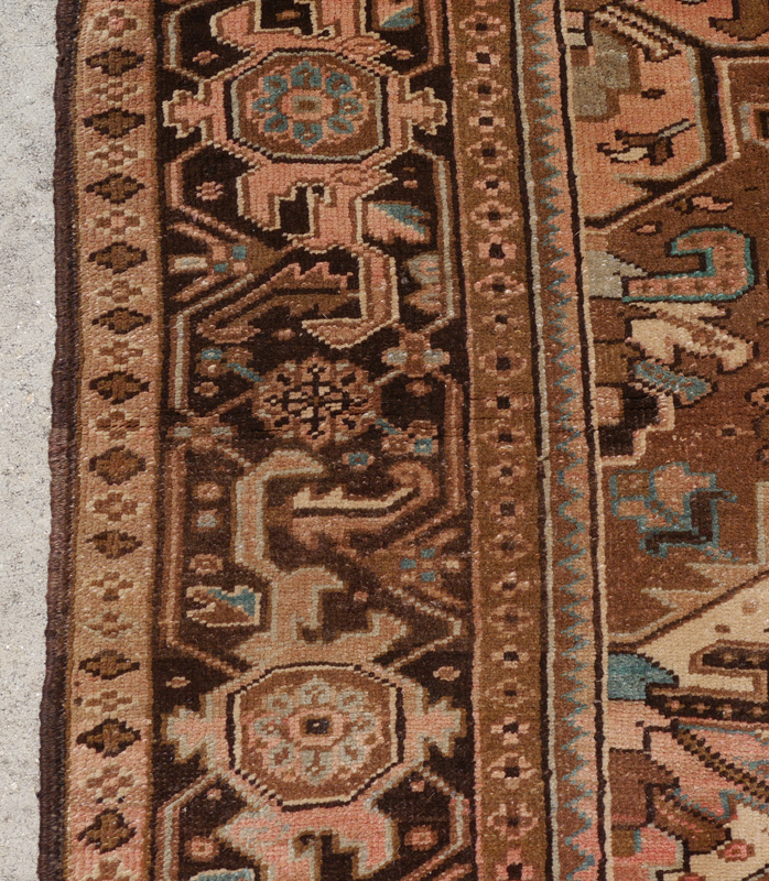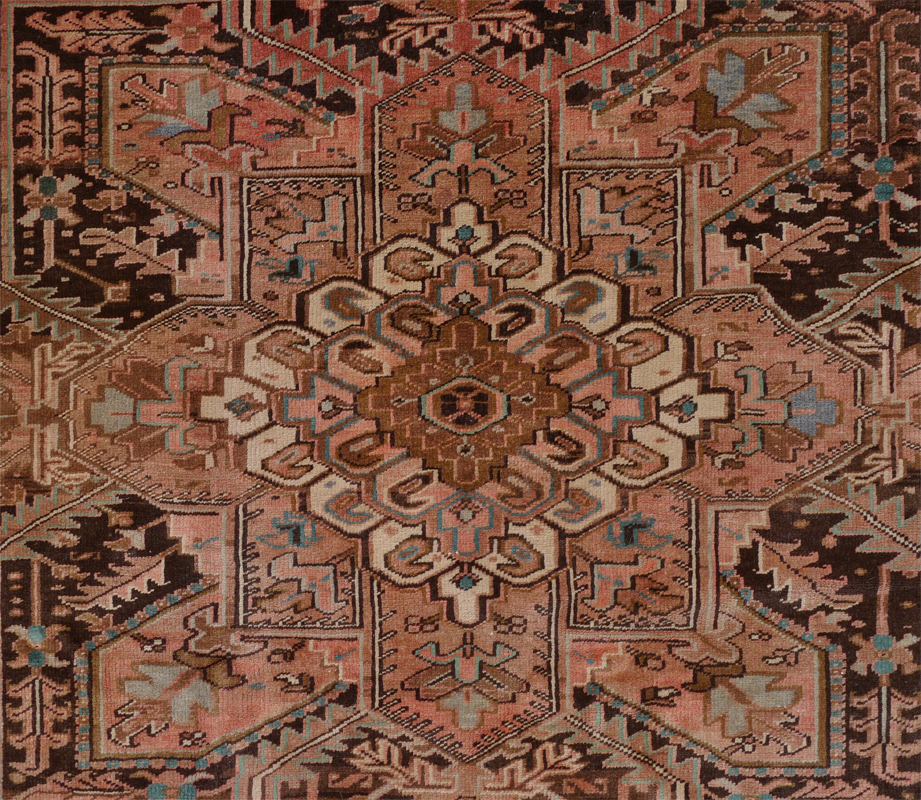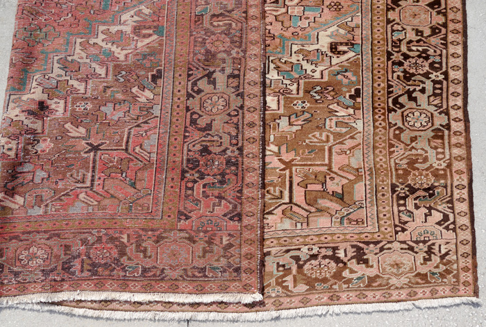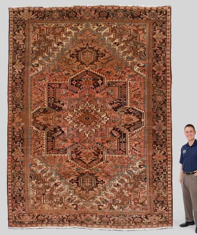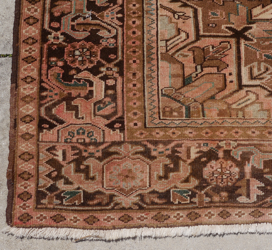 SEMI-ANTIQUE PERSIAN GORAVAN / HERIZ HAND KNOTTED WOOL RUG, 10'2'' x 12'10'': This traditionally designed Persian rug has an extremely large central star shaped medallion done in colors of ivory, peach, brown, blue, and black. At either end of the medallion palmettes shaped spandrels are suspended from the medallion. The four corners of the field are outlined by a saw toothed ivory ground band. The corners are like sections of the central medallion. The black ground of the main border ties in with the black used in the main design of the field. The overall look of the rug is very pleasing and will be an attractive addition to any room setting. Condition is good with fading that is even and adds to the overall look.