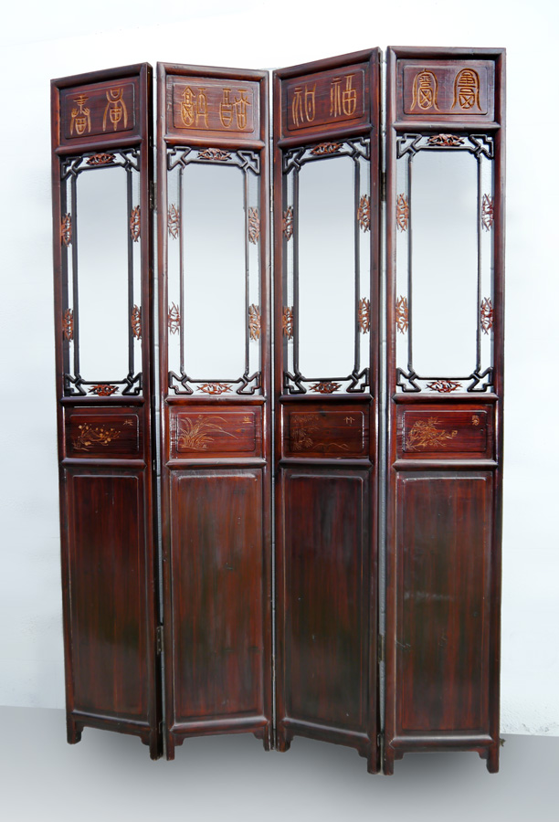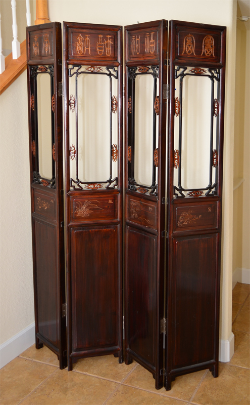 FOUR PANEL ORIENTAL SCREEN: Open work top section with solid base and decoratively etched smaller panels, each panel measures 79''h. x 13''w.