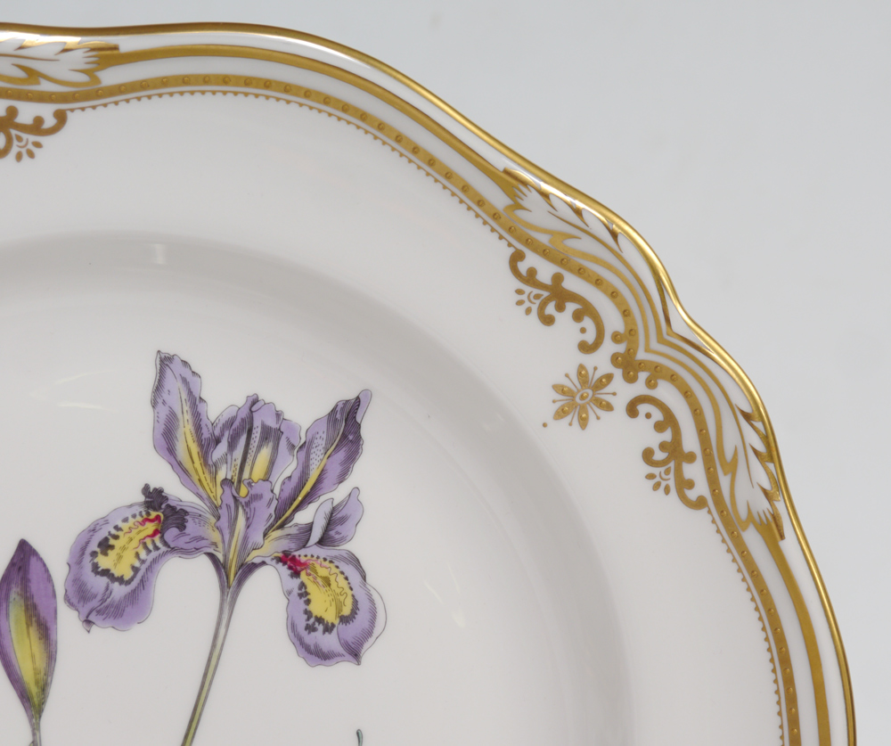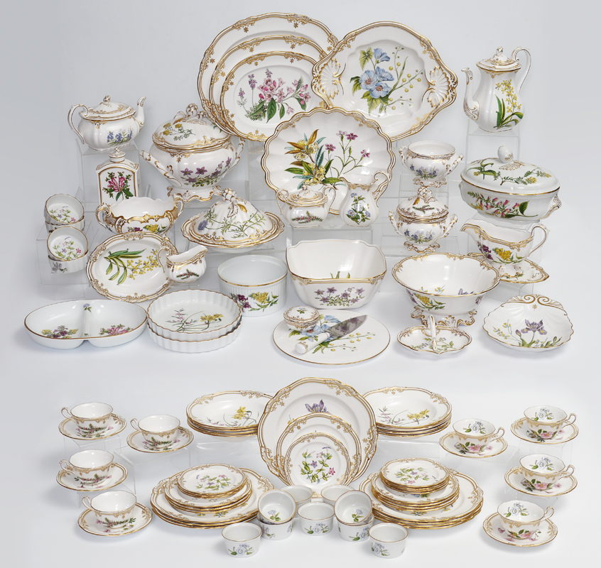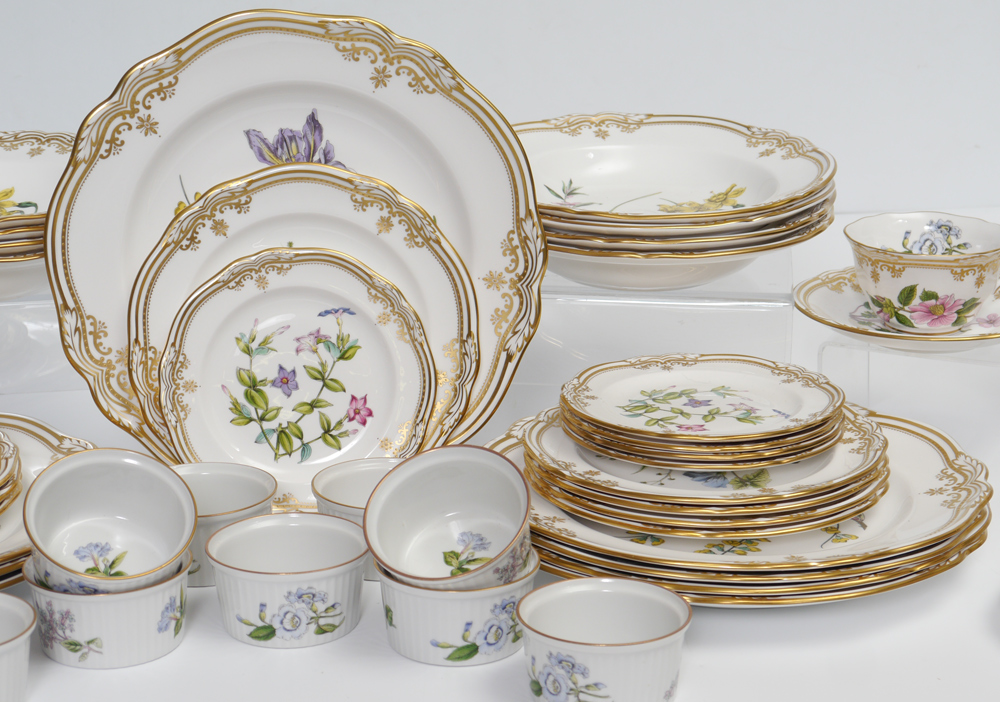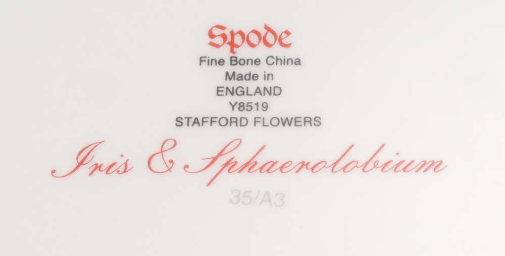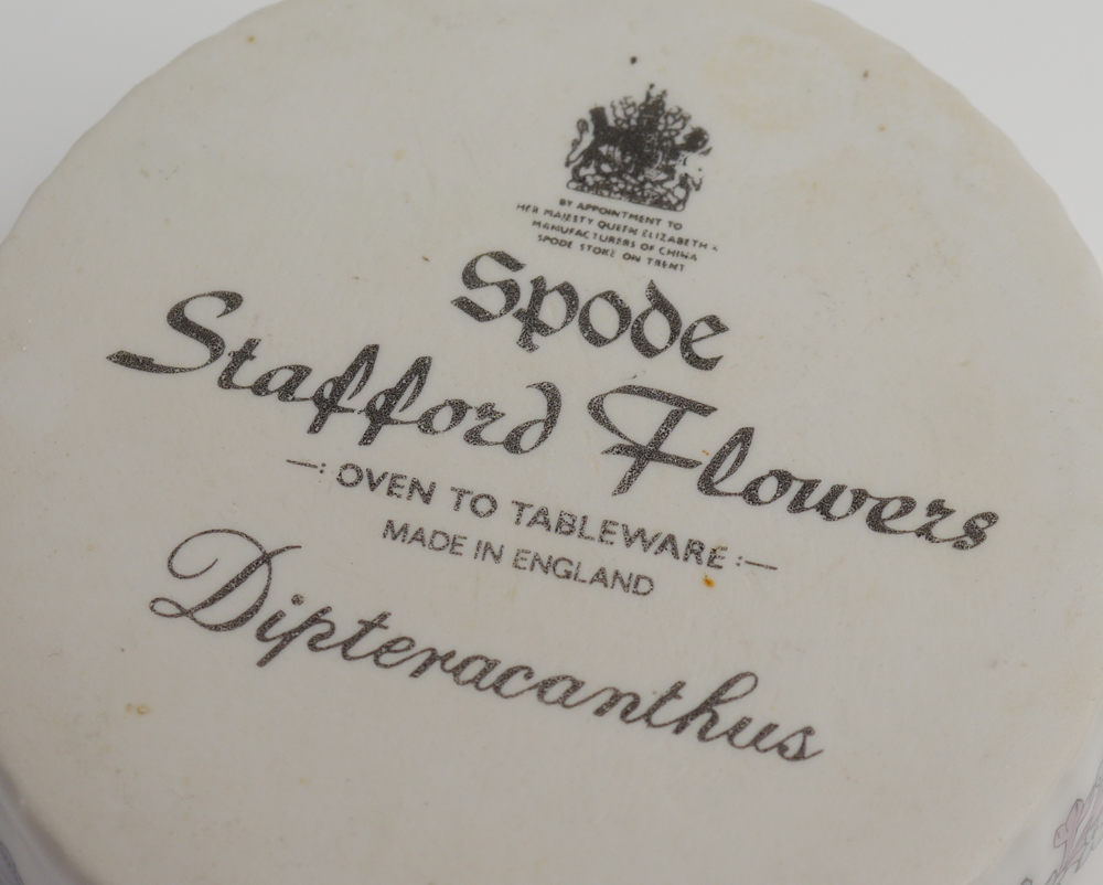 AN EXTRAVAGANZA OF SPODE ''STAFFORD FLOWERS'' CHINA: Service of approx. 90 pieces to include 8 dinner plates (11''), 8 salad plates, 8 bread plates, 8 soup bowls, 8 cups, 8 sauces, 9 ramekins, 4 bigger ramekins, 2 covered vegetables, 3 open vegetables, gravy boat, covered gravy bowl, coffee pot, tea pot, tea caddy, creamer, sugar, cream jug, divided dish, souffle dish, centerpiece pedestal bowl, large salad bowl, 2 quiche dishes, 14'' pasta bowl, cake plate and server, shell tray, bon bon, 3 platter ( 12 1/2'' - 17'') and the large covered tureen with the 16'' underplate.