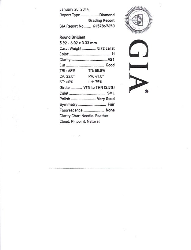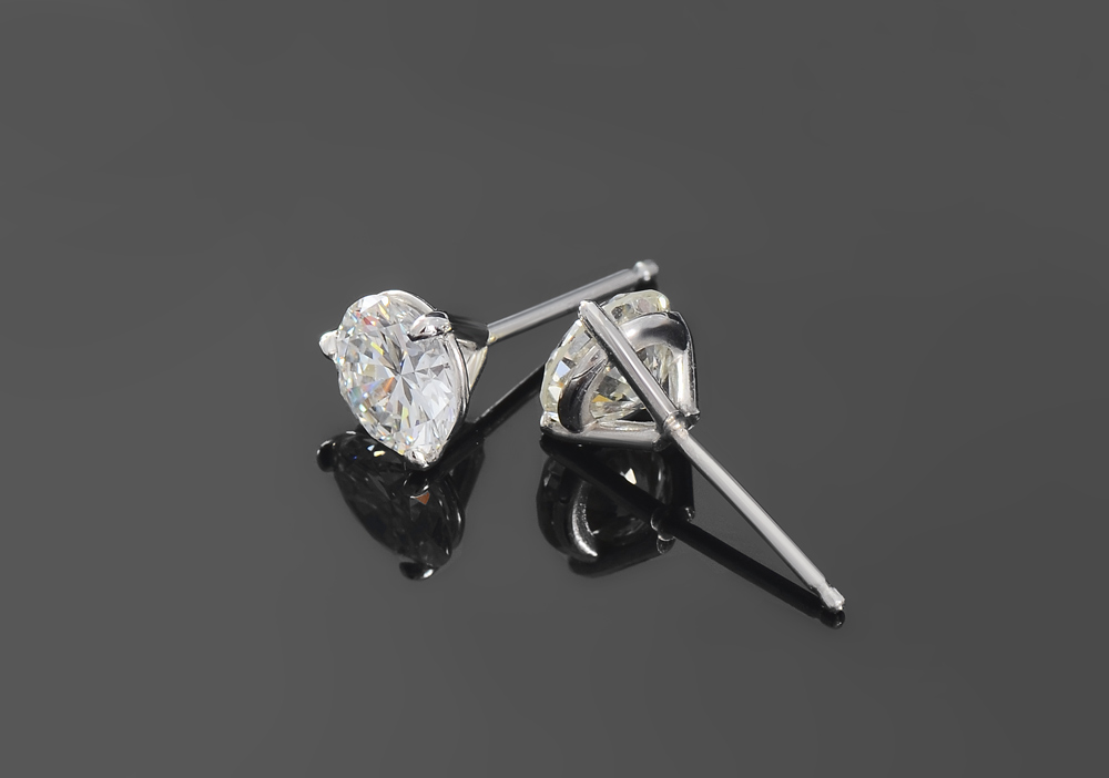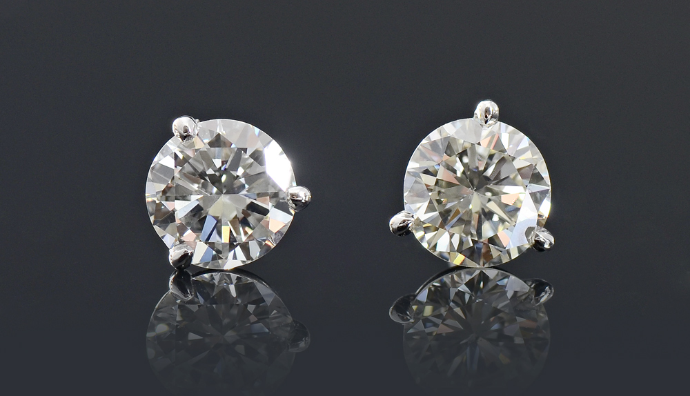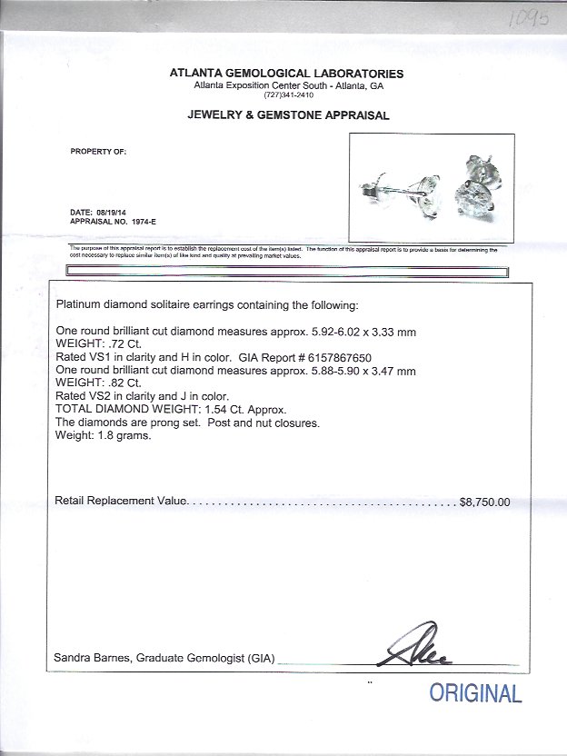 PLATINUM 1.54 CTW DIAMOND SOLITAIRE STUD EARRINGS: Martini style settings hold round brilliant cut diamonds. One, with GIA report, .72 Ct., VS1 clarity and H color. The second diamond is .82 Ct., VS2 in clarity and J color. Sold with current Atlanta Gemological GIA graduate's appraisal for $8750.