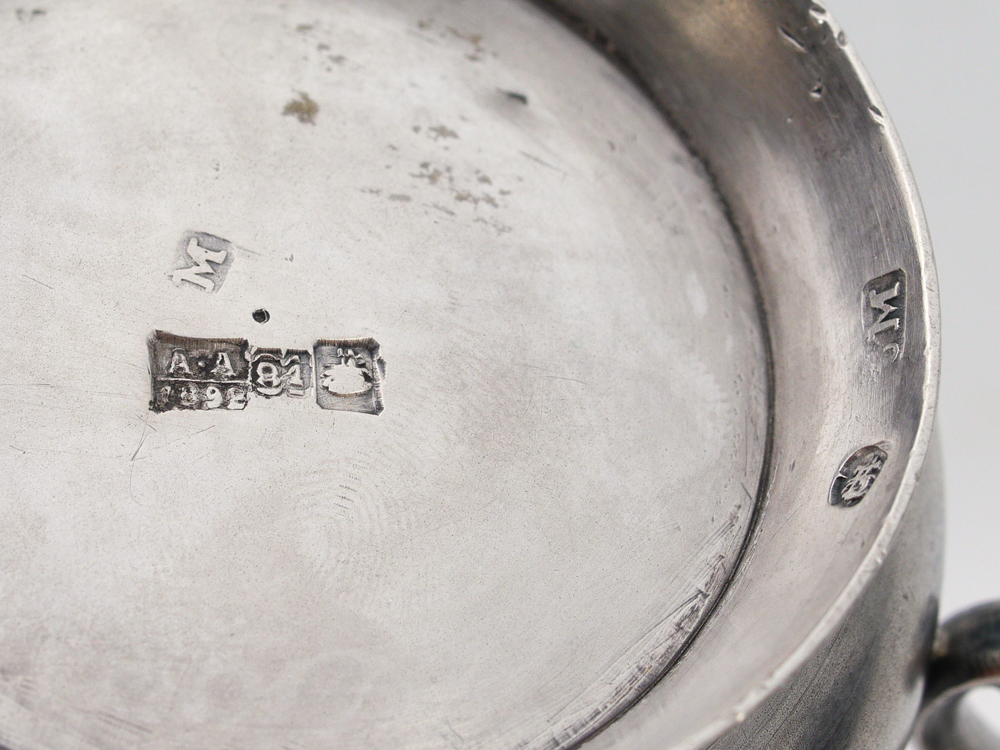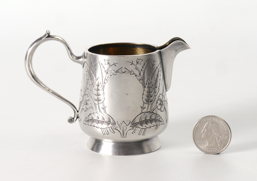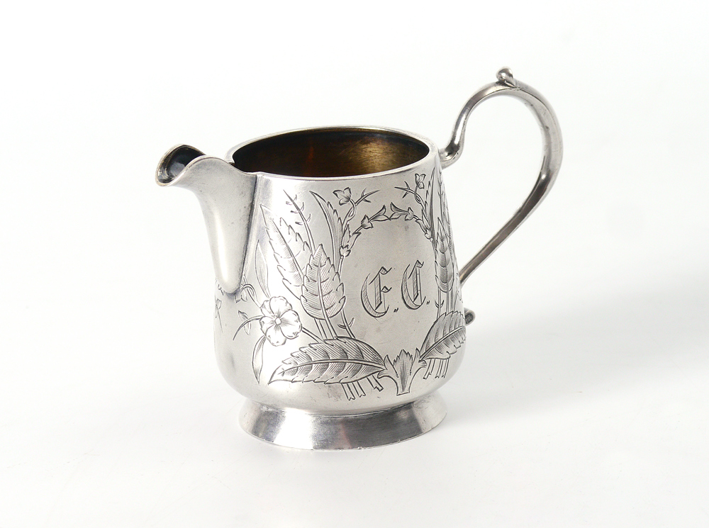 SYEN MYASOYUDOV RUSSIAN SILVER PITCHER: Moscow 1890's hallmarks with partial mark attributed to Syen Myasoyudov. Engraved body with foliate decoration, monogrammed. Traces of vermeil interior, measures 3'' h. x 4'', approx. 2.3 troy oz.