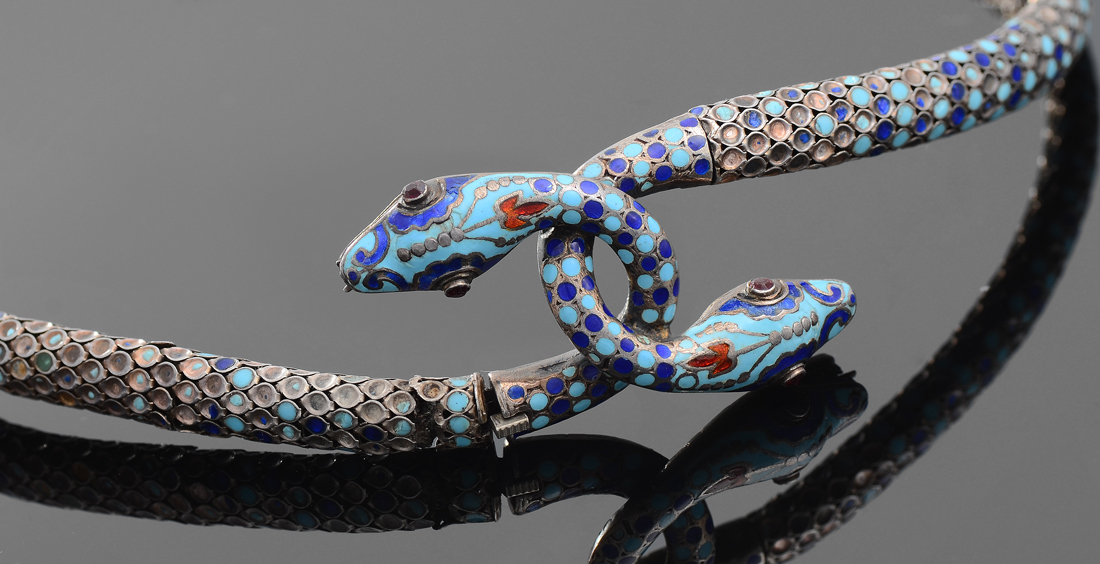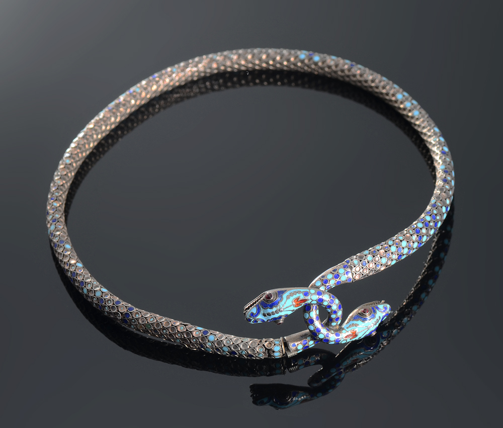 ENAMEL STERLING SILVER SNAKE NECKLACE: Slightly articulating necklace with Interlocking snake heads at the front clasp. Measures 15''. Weight: 1.58 troy oz.