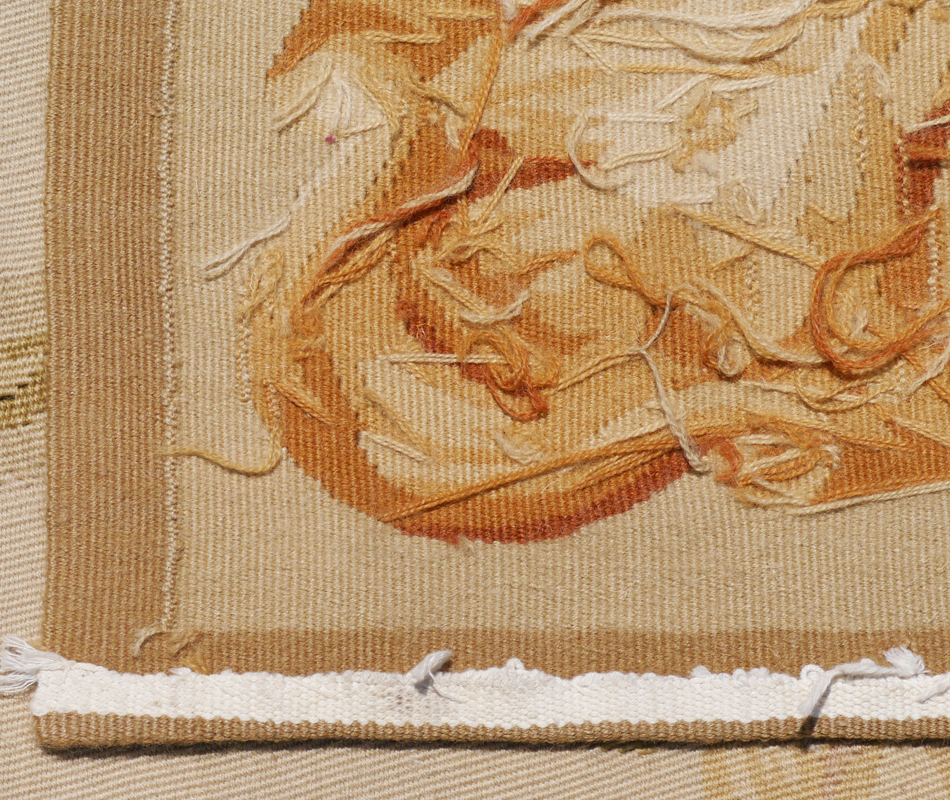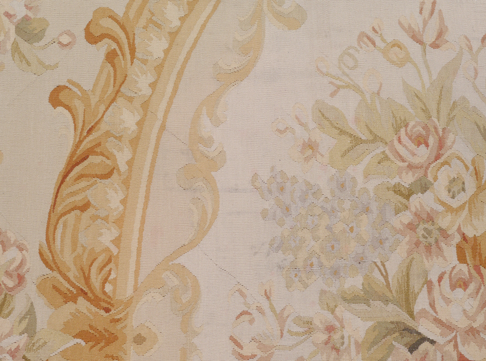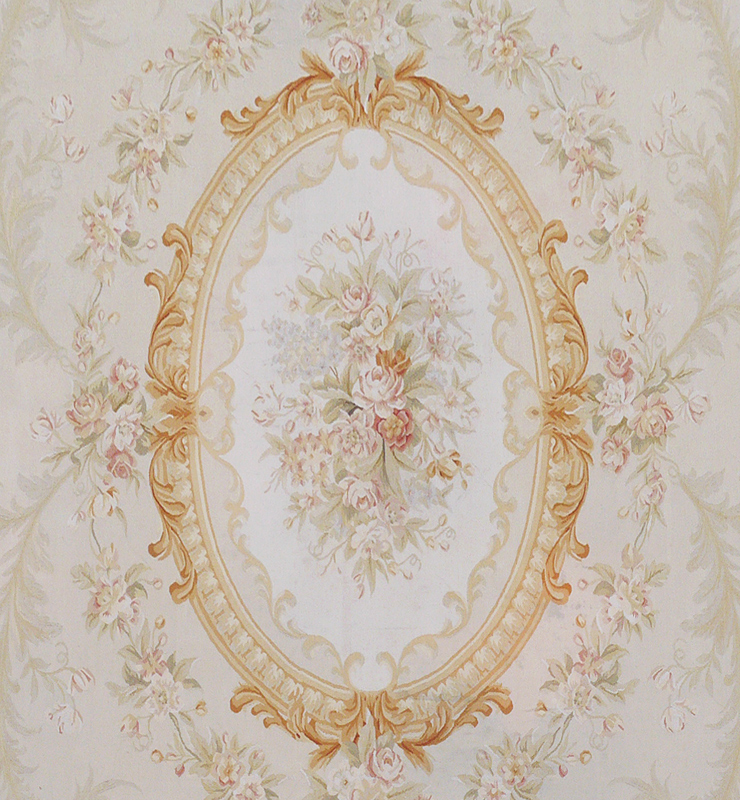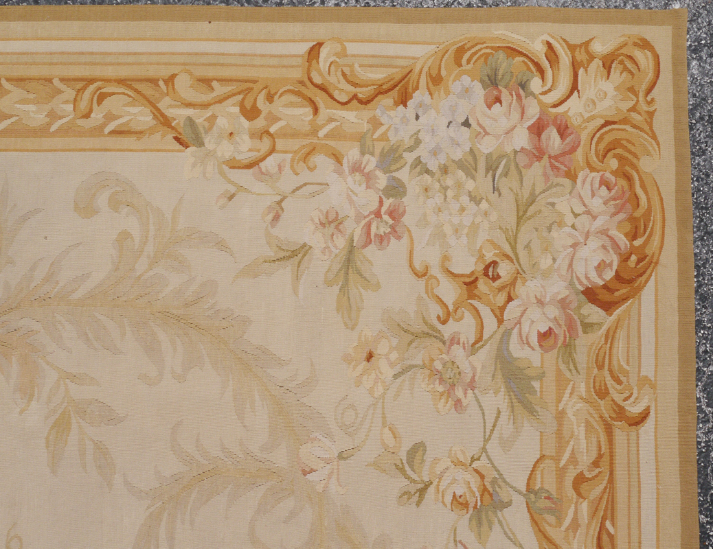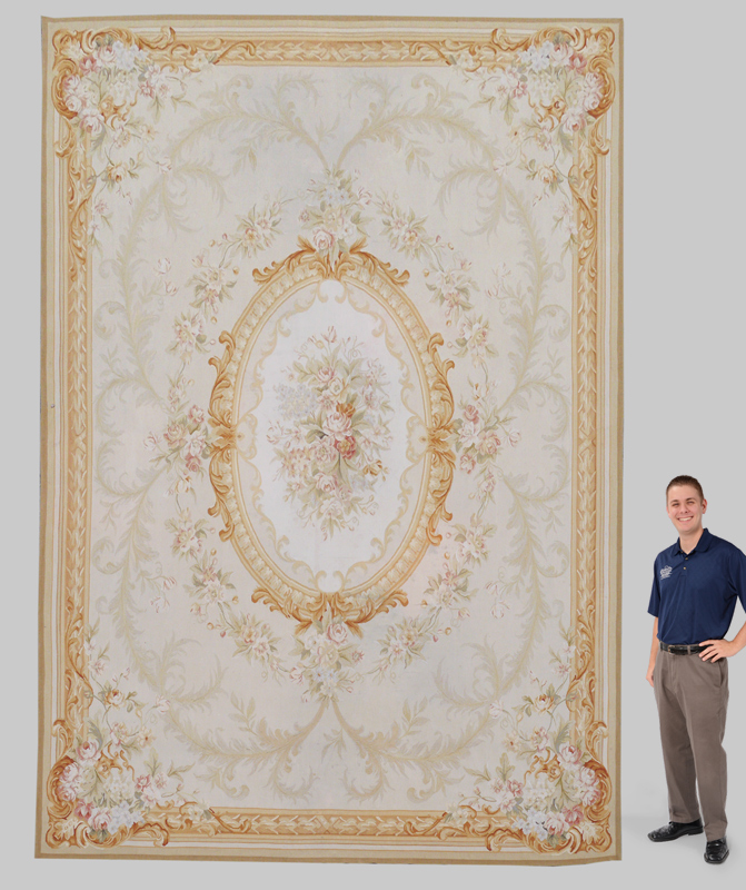 APPROX 20-35 YR OLD CHINESE NEEDLEPOINT AUBUSSON HANDMADE WOOL RUG, 9' 9'' x 14' 3'': This tapestry rug was woven in the type of design that was found in the finest, most elegant Salons in Paris in centuries past. The ivory oval center of the rug is outlined with a gold and yellow band that is also used as a border on the edges of the rug. There are tracery patterns of leaves and vines linking sprays of realistically drawn flowers of various types. For a matching smaller rug please see the next lot.