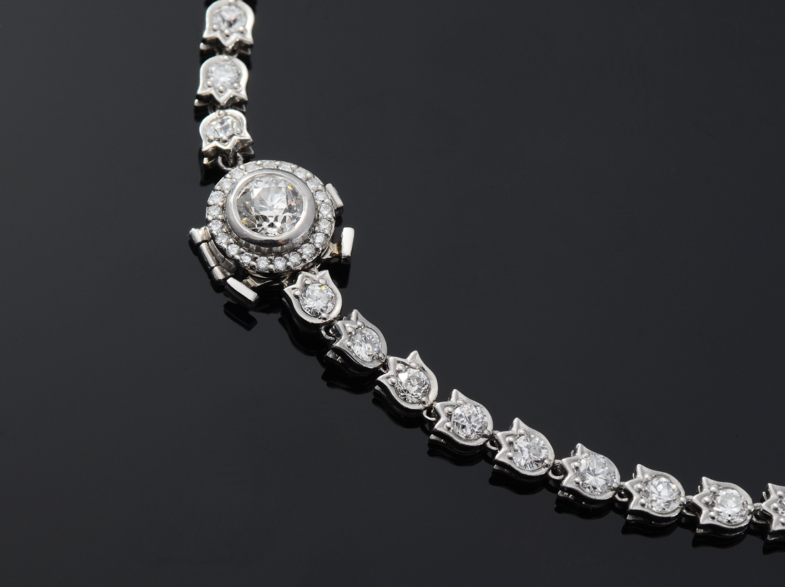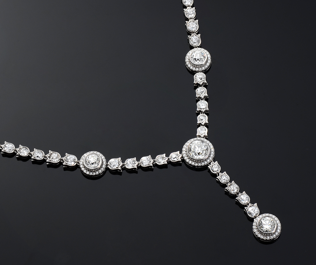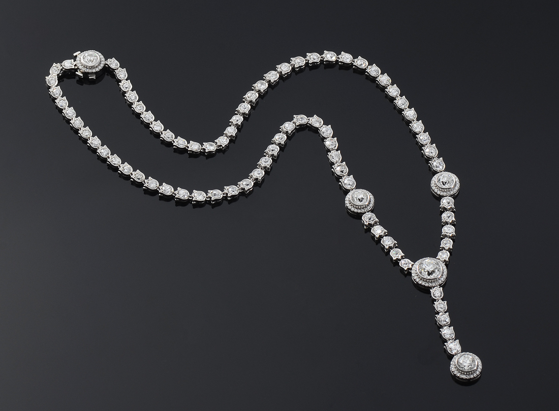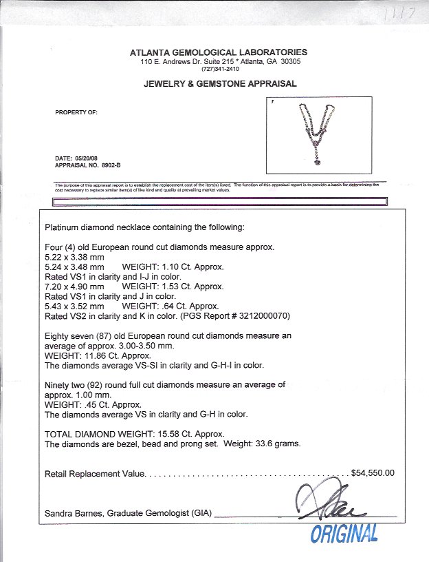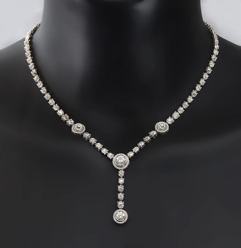 MAGNIFICENT PLATINUM 15.58 CTW DIAMOND ''Y'' NECKLACE: The four larger diamonds total approx. 3.27 Ct., I-J color, VS1-VS2 color. The chain is made of 87 old European round cut diamonds in tulip shaped settings, totaling approx., 11.68 Ct. Framing the large diamonds are an additional 92 diamonds totaling approx. .45 Ct. TOTAL diamond weight 15.58 Ct. Length 16'' plus the 1 1/2'' drop. Weight: 33.6 grams. Sold with 2008 Atlanta Gemological GIA graduate's appraisal for $54,550.