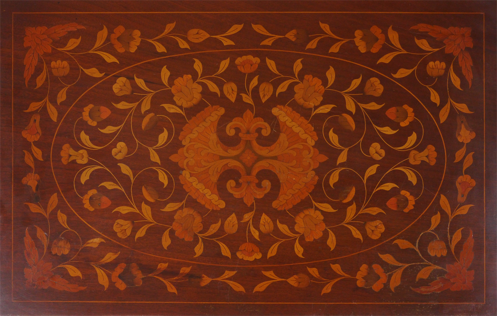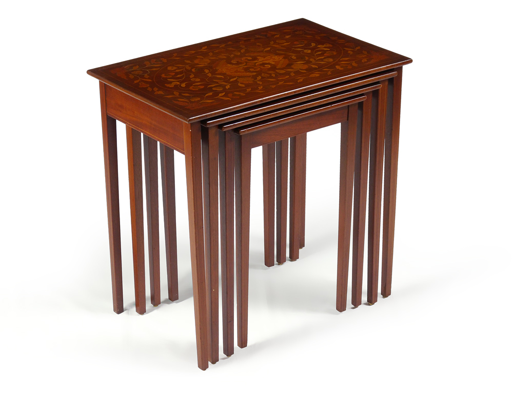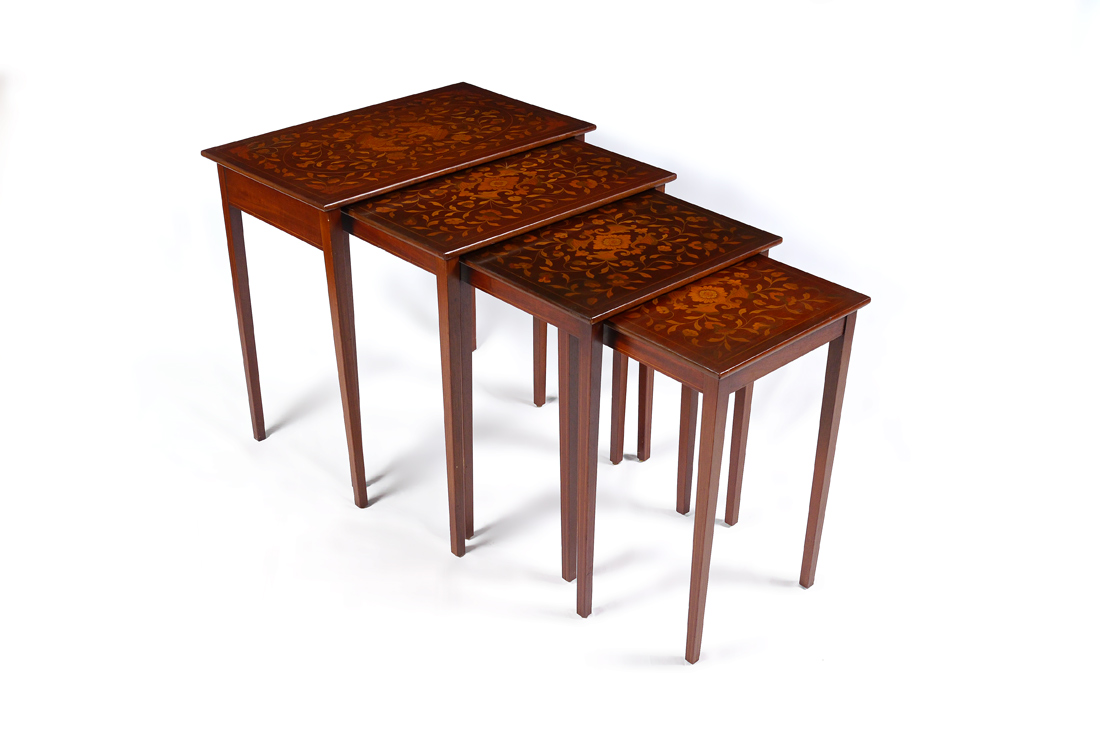 DUTCH MARQUETRY INLAID NESTING TABLES: Lovely floral motif to tops, largest slightly different pattern, all with string inlay to borders and legs. Largest measures 27 3/4''h. x 17 7/8'' x 28'', smallest has a 16'' square top!