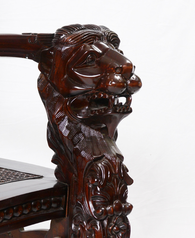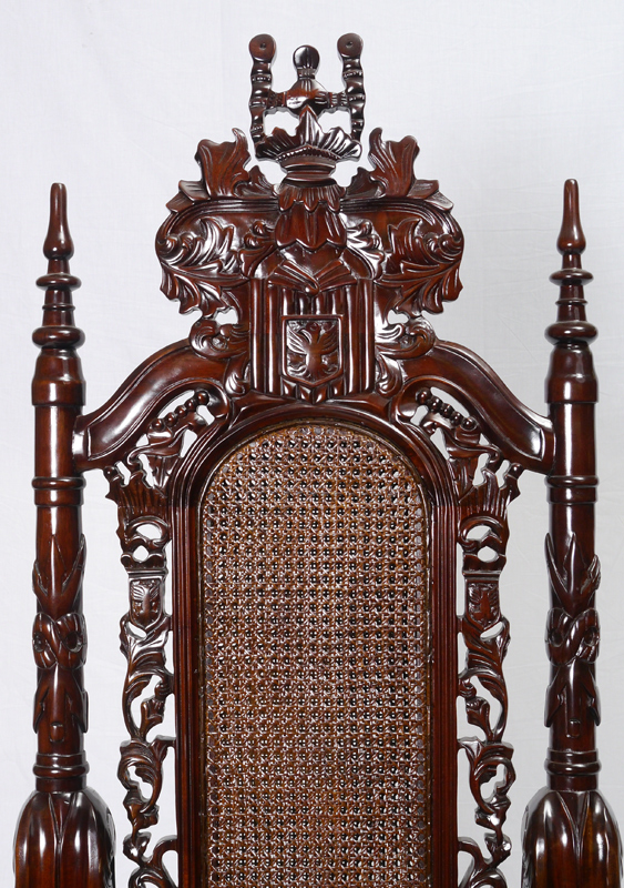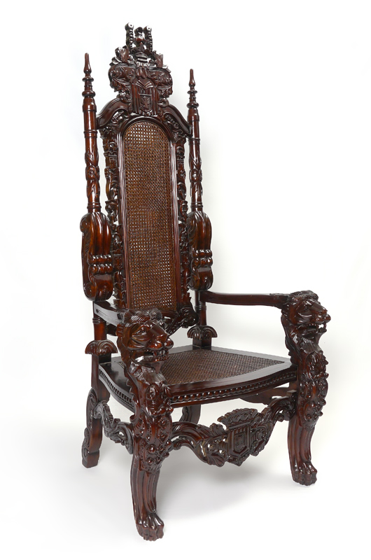 LARGE CONTEMPORARY CARVED THRONE CHAIR: 20th century profusely carved with foliate and heraldic motifs, lion hand holds, carved skirt, paw feet. Rush back and seat, 70'' h. x 35 1/2'' x 25 1/2''.