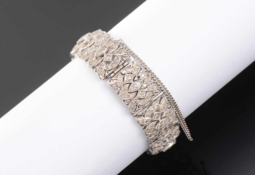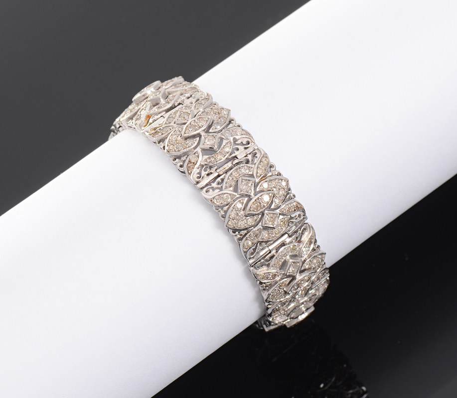 4.00 CT DIAMOND BRACELET: 14K white gold wide link bracelet contains 252 round single cut diamonds totaling approx. 4.00 Ct. rated SI in clarity and H-I-J in color. The diamonds are prong set. Weight: 30.7 grams. Locking closure with safety chain. Width: 5/8''. Length: 6.1/2''