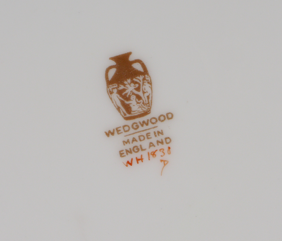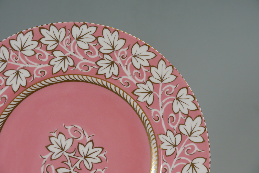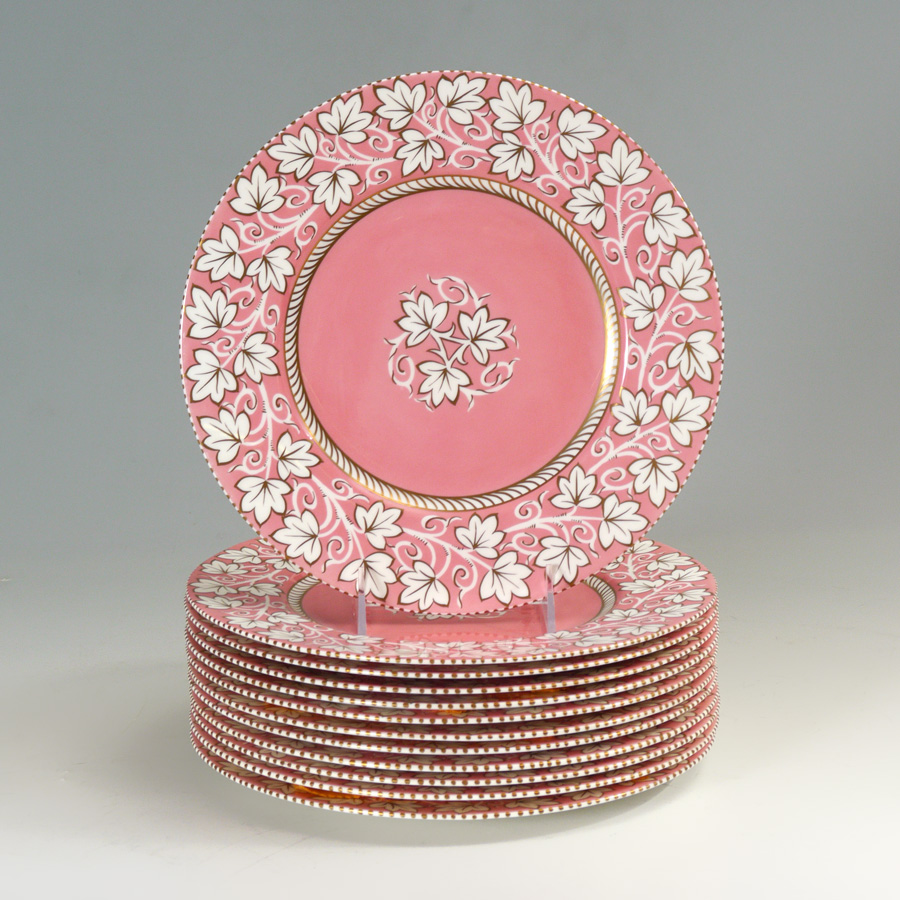 SET OF 12 WEDGWOOD CHINA SERVICE PLATES: Pattern 1830, pink with subtle gold accent. Measures 10 3/4'' dia.