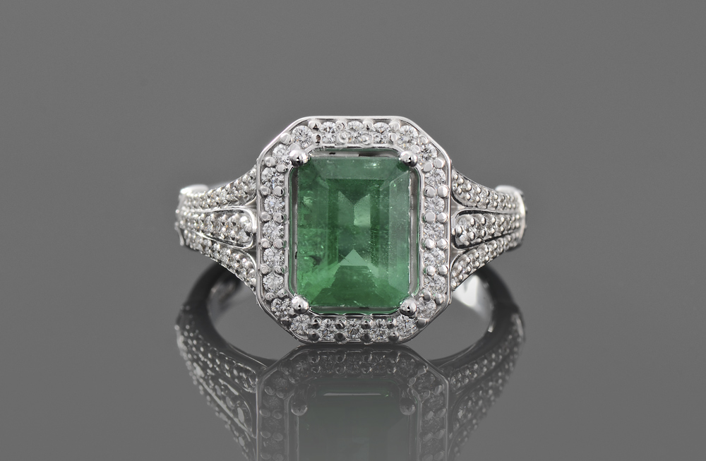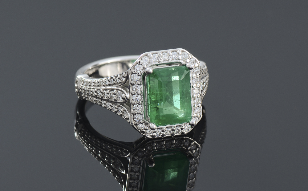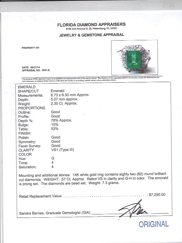 EMERALD & DIAMOND RING: 14K white gold ring centering a 2.3 Ct emerald cut emerald of VS1 clarity and 4 saturation. Framing the emerald and on the triple band shank are 82 round brilliant diamonds totaling approx. .57 Ct., rated VS in clarity and G-H color. Prong set emerald, the diamonds are bead set. Size 7, weight 7.3 grams. Sold with current Florida Diamond Appraisers GIA graduates appraisal for $7,250.