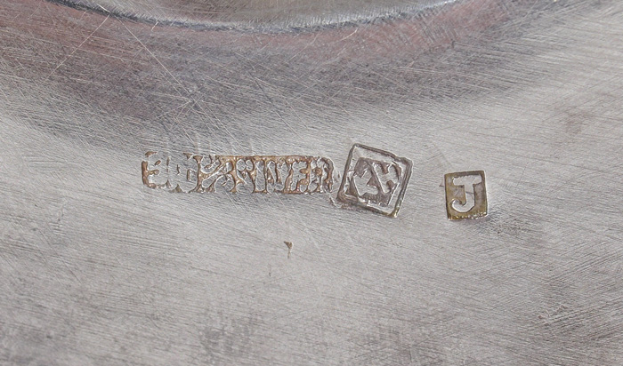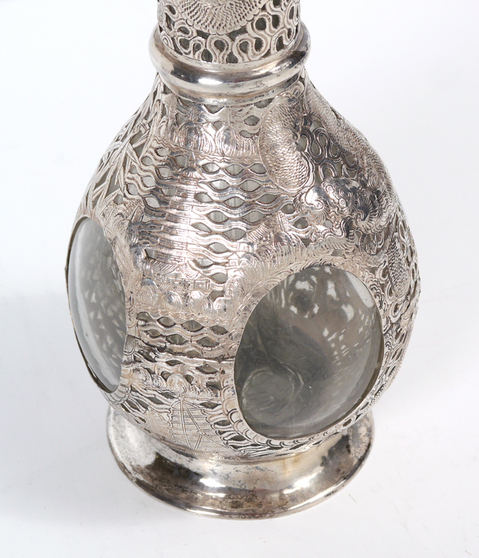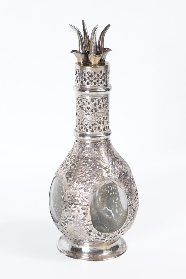 CHINESE EXPORT SILVER MOUNTED QUADRUPLE CORDIAL DECANTER: Clear glass decanter with 4 internal section for different liquors. Reticulated silver mounted with dragon, bamboo and floral motifs, marked on base with 90% Silver, KH in diamond and J. Overall measures 13 1/4'' h. x 5'' dia.