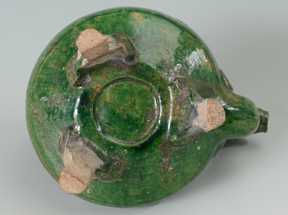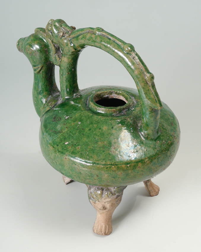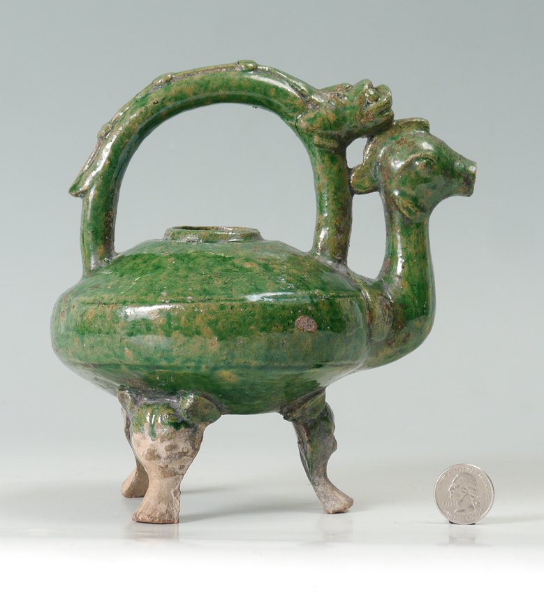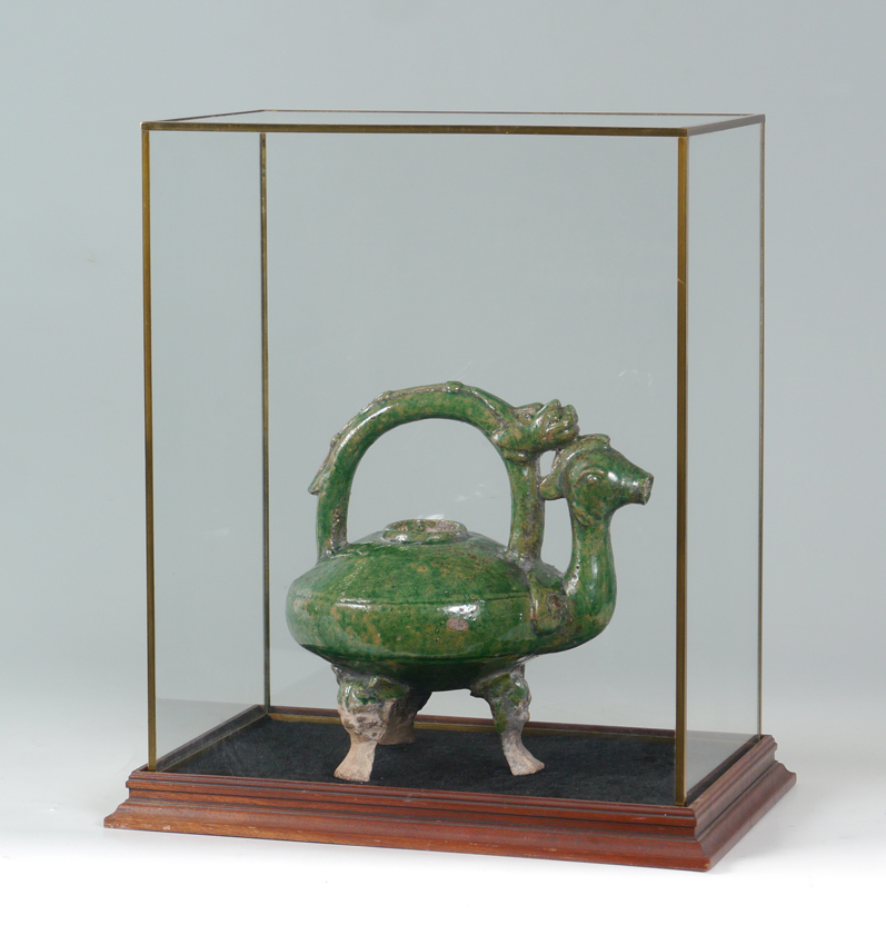 CHINESE FIGURAL CELADON WATER POT: Celadon glaze, figural animal handle and spout, on 3 legs with figural feet. 7 1/2'' h. x 7''. Actual age unknown. Sold with glass display case 13'' h. x 11 1/2'' x 7 1/2''.