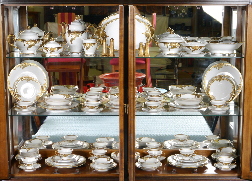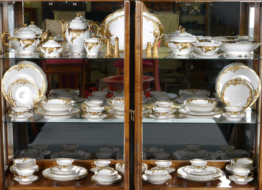 WAWEL POLISH CHINA SERVICE FOR 12: Pattern WAV19. Foliate gold embossed rims with black accents, service for 12, approx. 97 pieces by Wawel China to include 12 dinner plates (10 5/8''), 12 salad plate (7 5/8''), 12 bread plates (6 7/8''), 12 soup bowls, 12 dessert bowls, 12 cups and 12 saucers, 2 oval platters (15'' and 13'' ), covered vegetable, open vegetable, gravy boat, open creamer, covered sugar, coffee pot (9 3/4'' h. x 10''), teapot (7 1/2'' h. x 11 1/4''). Sold together with 2 sets of gold embossed shakers.