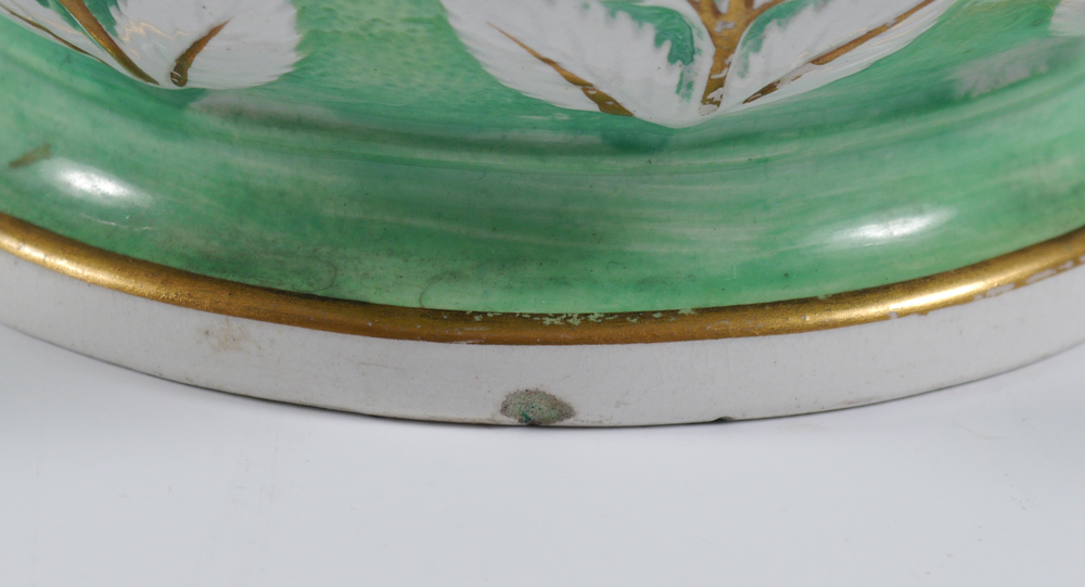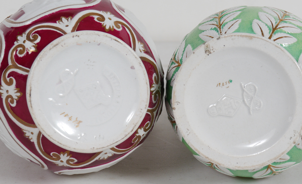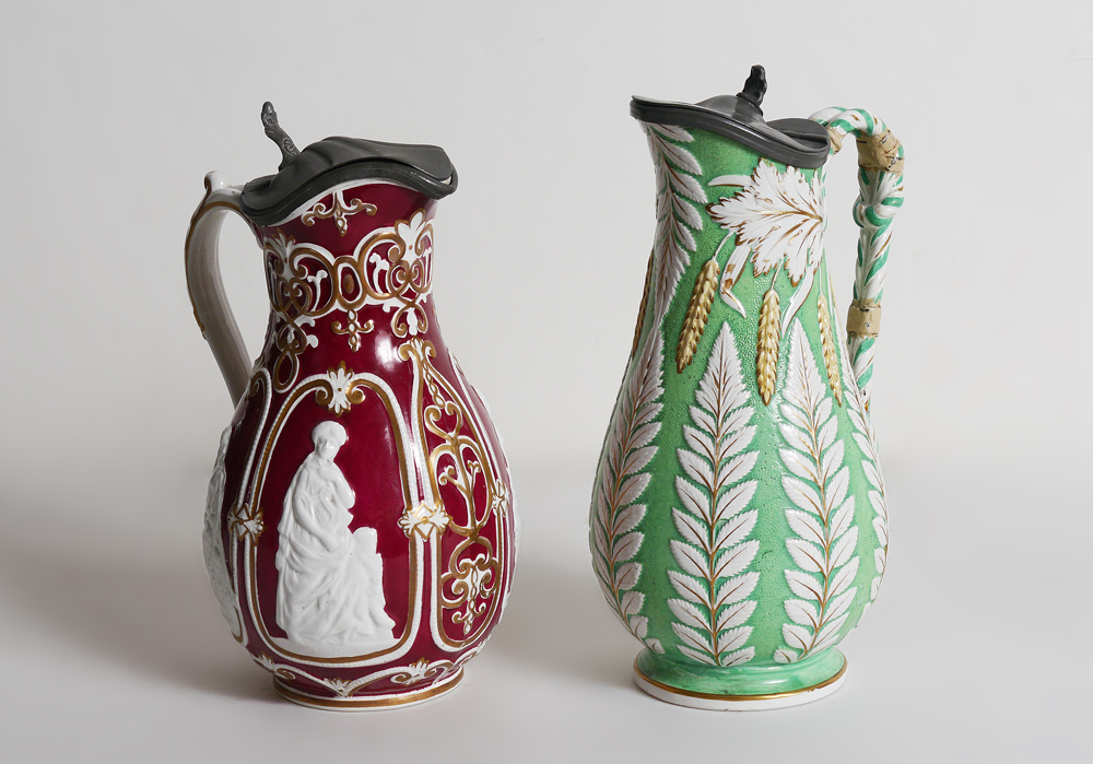 2 STAFFORDSHIRE SYRUP PITCHERS: Ca 1870, Wm. Brown & Son. One with high relief images of Art, Science, Music and Commerce. The second pitcher is in an agricultural wheat design. Both with hinged metal lids. Measure approx. 10'' tall.