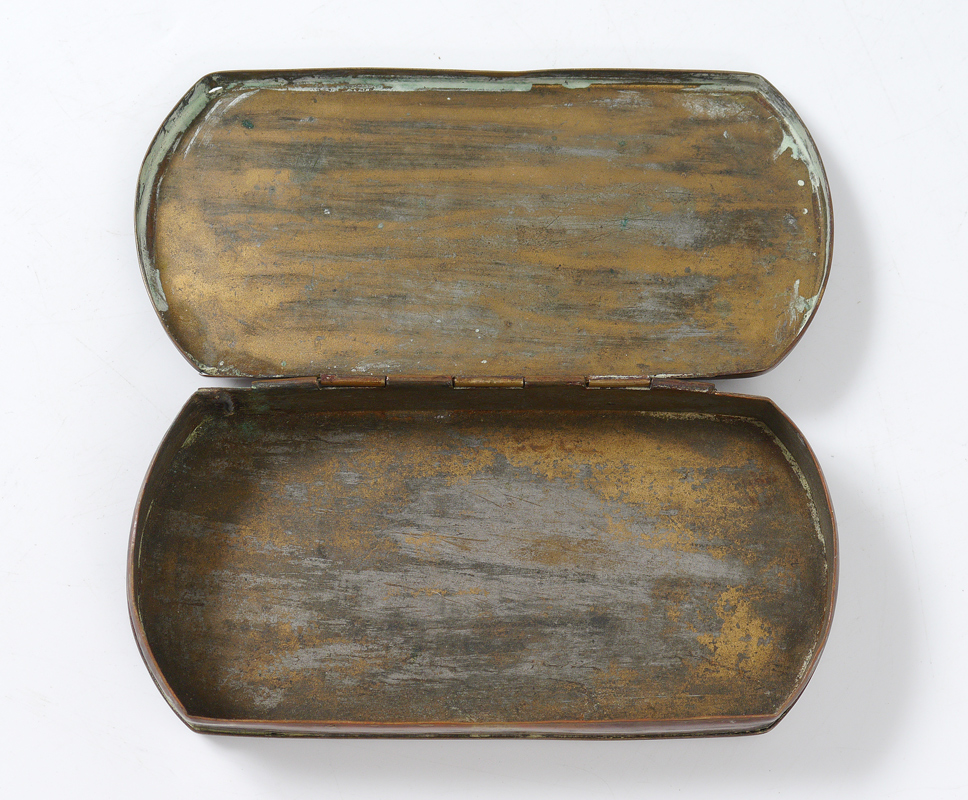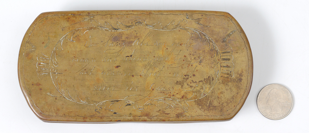 18TH CENTURY ENGRAVED BRASS BOX: Hinged lid with engraved decoration of 18th century soldier and maiden at a fruit tree in garden with illegible writing either side. Base engraved as well with illegible dedication. Overall measures 1'' x 5 7/8'' x 3''