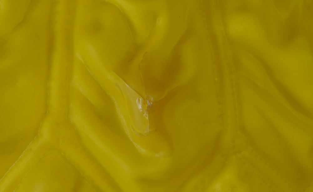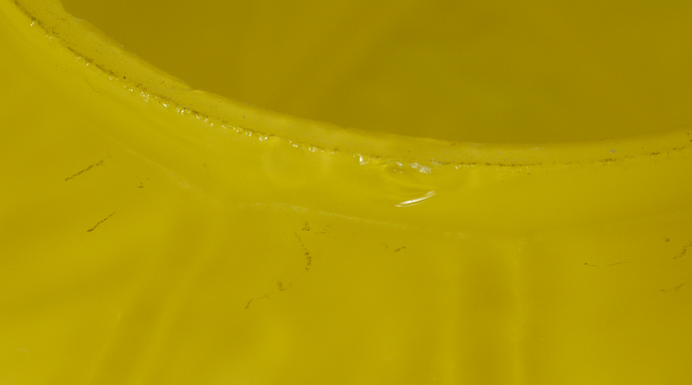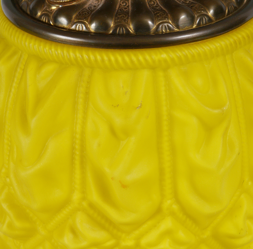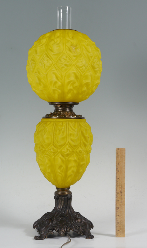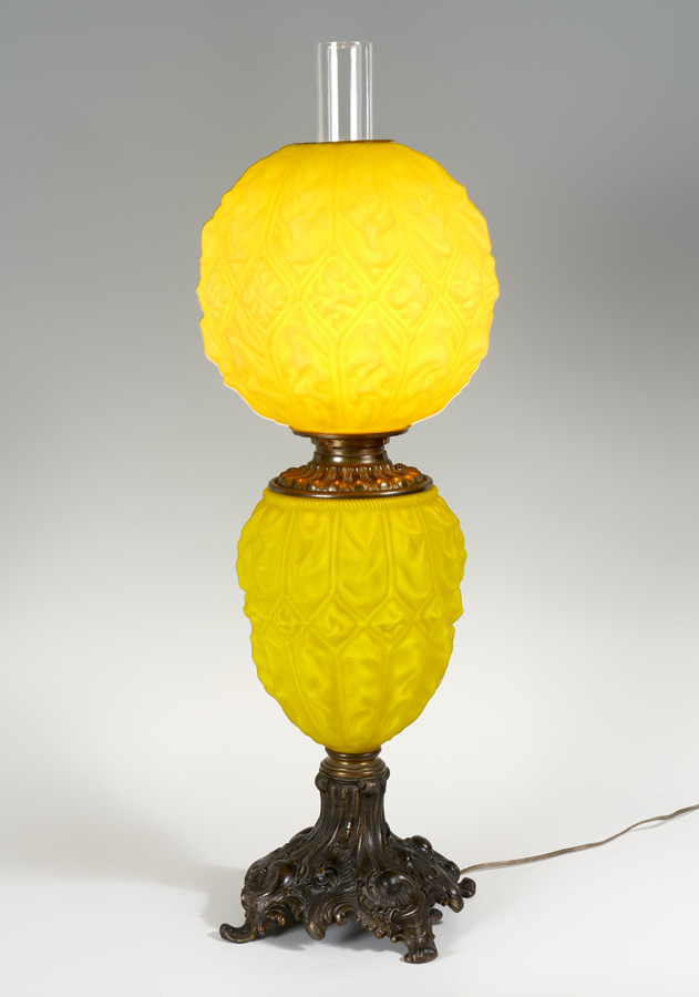 YELLOW SATIN GLASS GONE WITH THE WIND LAMP: Blown out linen motif globe and shade, electrified, measures 32'' tall including chimney. Unmarked as to maker.