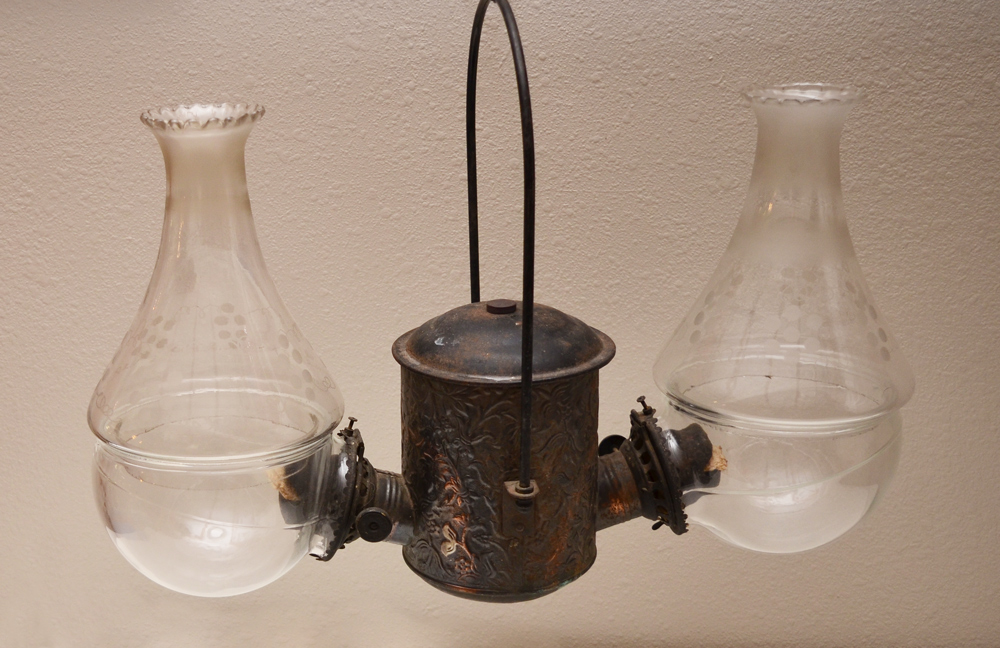 ANGLE MANUFACTURING CO DOUBLE FONT HANGING LAMP: Embossed font with grape design etched glass chimneys and clear glass elbow shades. Signed on thumb wheels. Measures approx. 17'' h. , the shades 9''.
