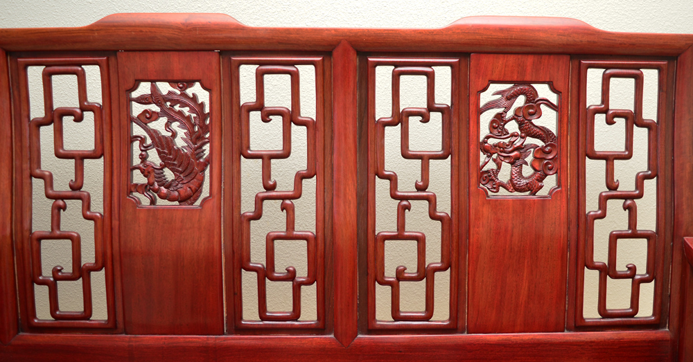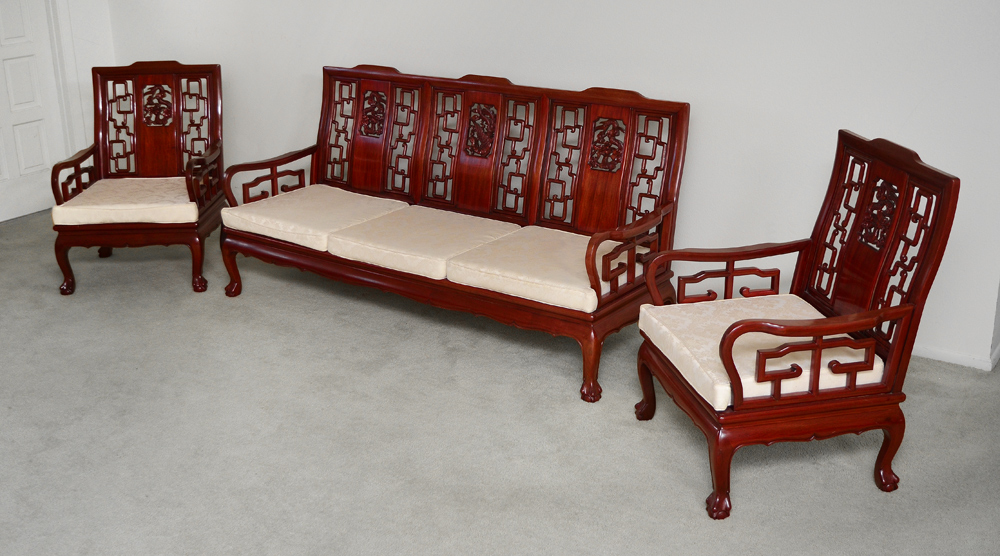 3 PIECE CHINESE ROSEWOOD PARLOR SET: Comprising of a sofa and 2 arm chairs, each with carved and pierced back with dragon and phoenix panels, shaped arms and skirt, ending in claw and ball feet. White upholstered seat cushions. Sofa measures 36'' h. x 26'' x 26'', chairs 36 1/2'' h. x 72 3/4'' x 26''.