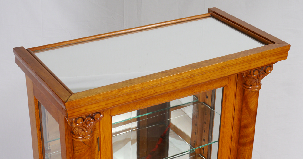 CARVED SATIN WOOD DISPLAY CABINET: Carved 3/4 column stiles, mirrored back, 4 glass shelves. Measures 59 3/4'' h. x 29 1/4'' x 15 3/4''.